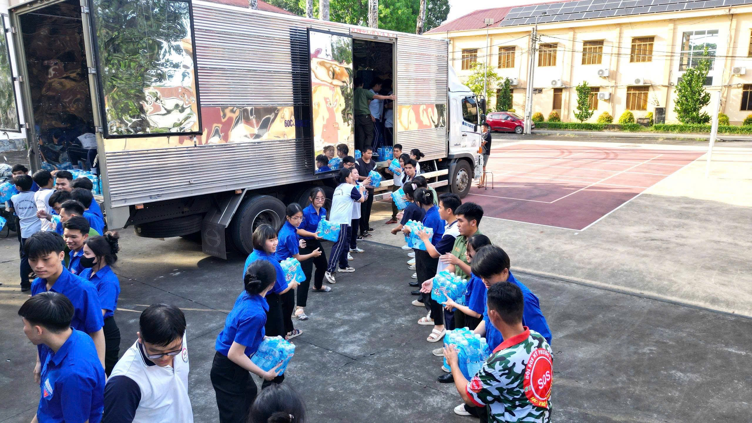 Đoàn viên thanh niên xã Trảng Bom tích cực hỗ trợ Công an xã Trảng Bom vận chuyển hàng hóa, quần áo, nhu yếu phẩm lên xe