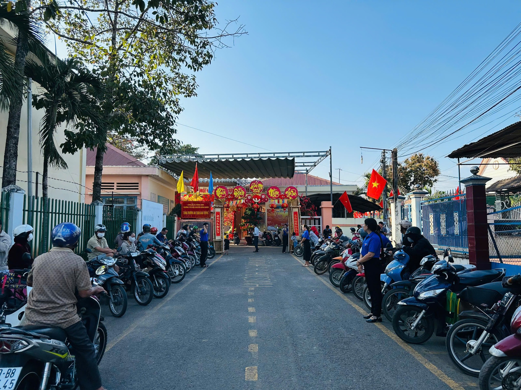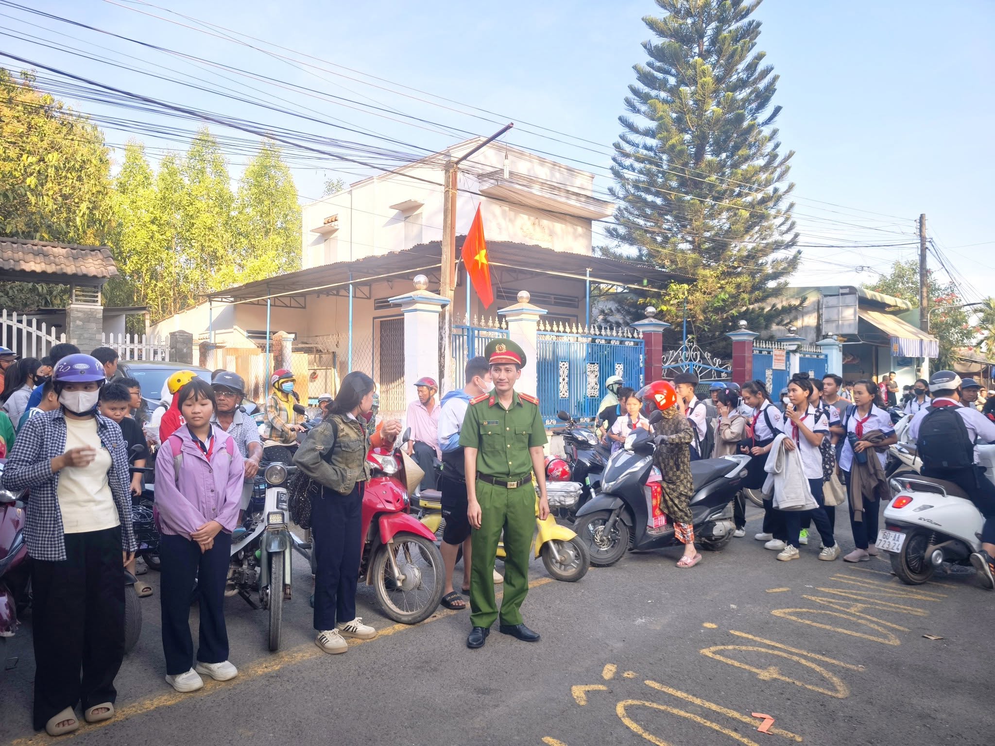 Phối hợp với lực lượng Công an xã tổ chức kiểm tra, nhắc nhở và xử lý các trường hợp vi phạm quy định về dừng, đỗ xe, lấn chiếm lòng lề đường trước khu vực cổng trường; đồng thời vận động phụ huynh, người dân nâng cao ý thức tự giác chấp hành các quy định về an toàn giao thông.