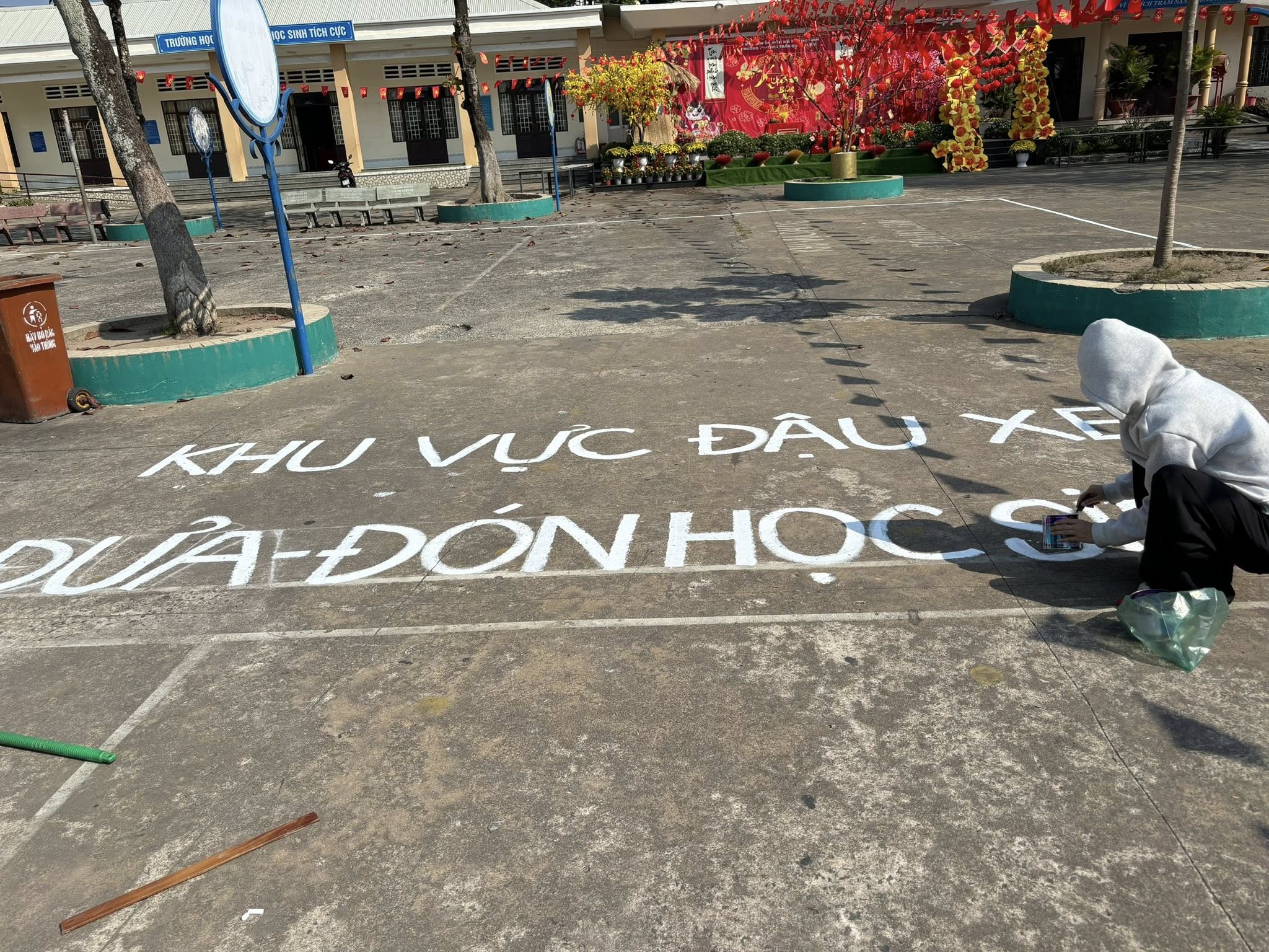 Làm mới, tu sửa mô hình: Tổ chức tô, vẽ lại vạch sơn quy định cụ thể khu vực dừng, đỗ xe cho phụ huynh; kẻ vạch phân làn lối đi bộ cho học sinh; bố trí biển báo, pano tuyên truyền nhằm nâng cao ý thức chấp hành Luật Giao thông đường bộ cho người dân khi đưa, đón học sinh.