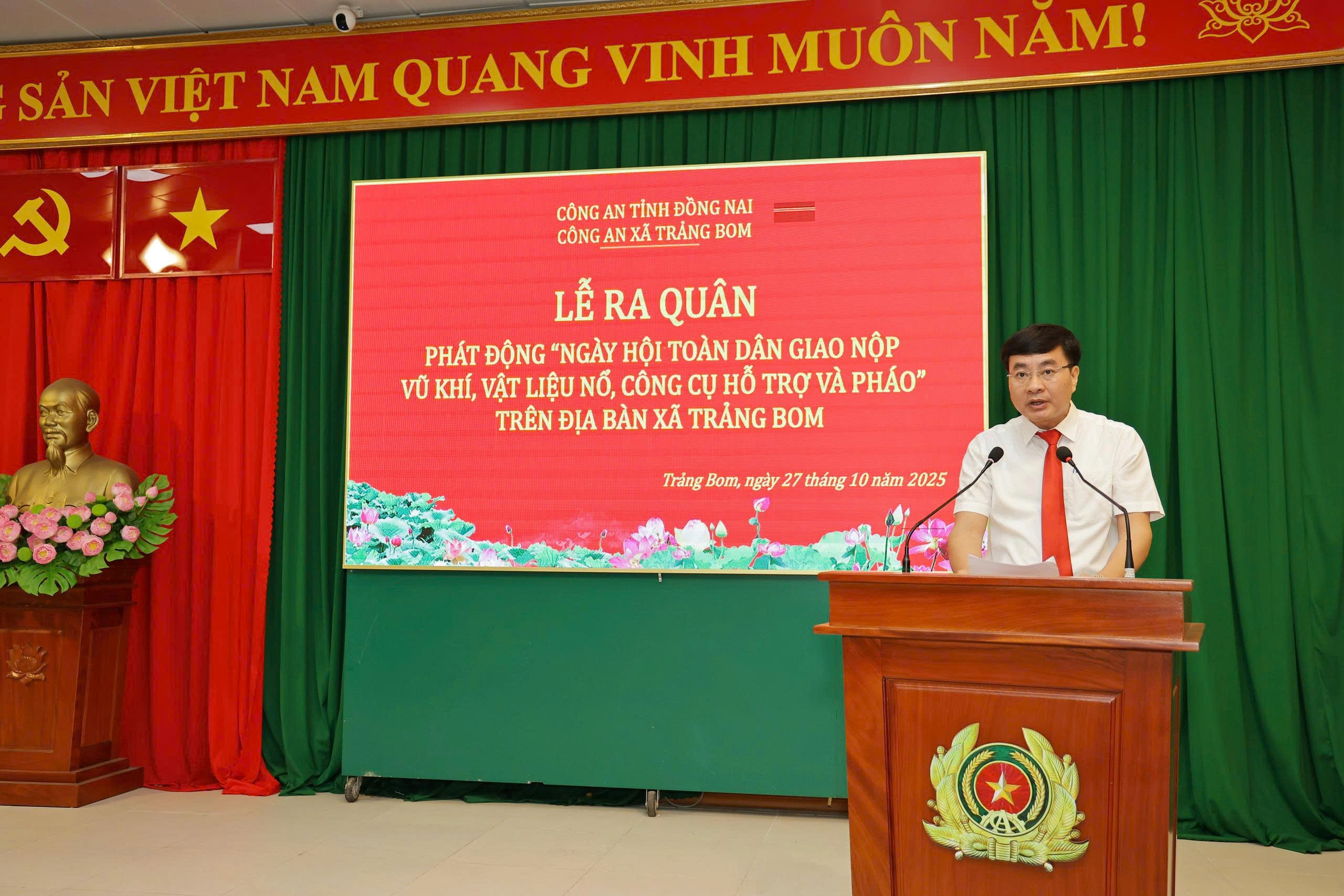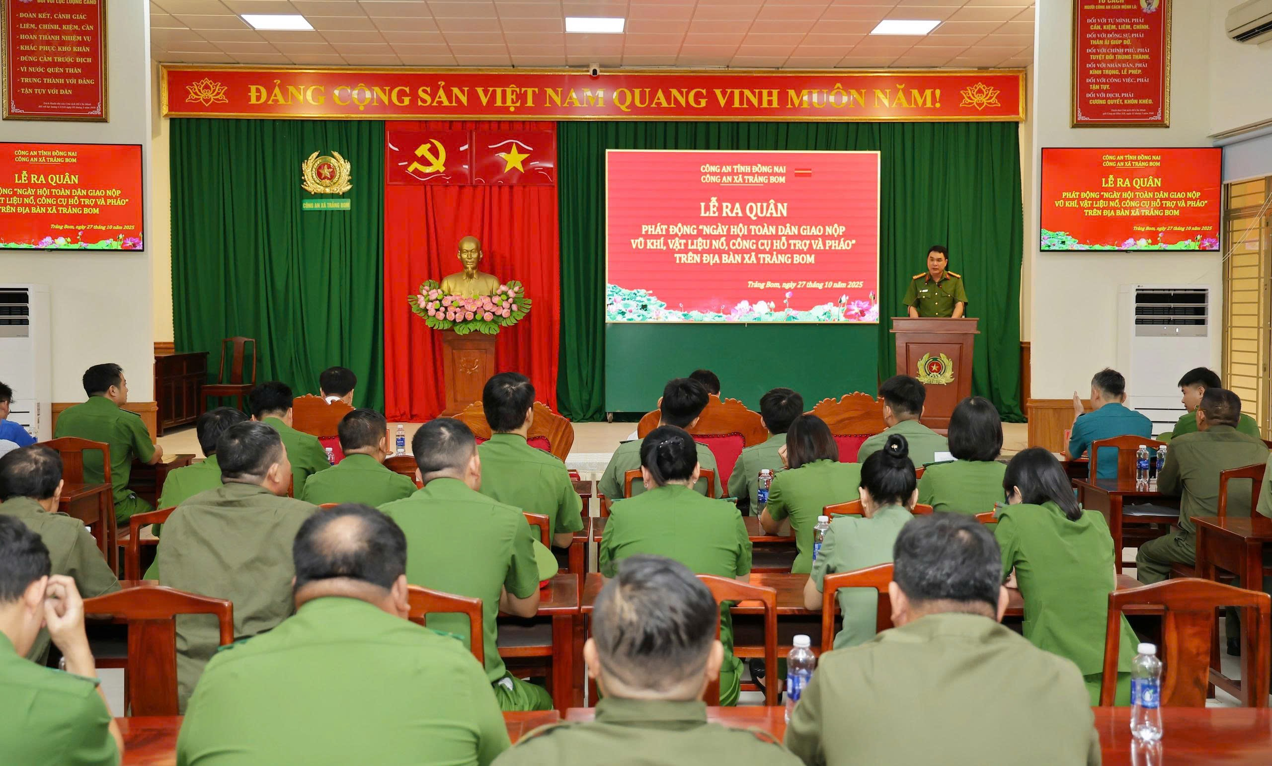 Theo đó, đợt cao điểm vận động Nhân dân giao nộp và phòng ngừa, đấu tranh với tội phạm, vi phạm pháp luật về vũ khí, vật liệu nổ, công cụ hỗ trợ và pháo diễn ra từ ngày 15/10 đến ngày 15/12/2025. Trong thời gian này, Công an xã Trảng Bom phối hợp với các cơ quan, đơn vị tích cực tuyên truyền, phổ biến các văn bản quy phạm pháp luật về công tác quản lý, sử dụng vũ khí, vật liệu nổ, công cụ hỗ trợ và pháo, những phương thức, thủ đoạn mới, hậu quả, tác hại, những nguy hiểm và kết quả đấu tranh phòng, chống tội phạm, vi phạm pháp luật về vũ khí, vật liệu nổ, công cụ hỗ trợ và pháo của lực lượng chức năng; tuyên truyền nhân dân phát hiện, giao nộp vũ khí, vật liệu nổ, công cụ hỗ trợ và pháo; tích cực tham gia xây dựng các mô hình tại khu dân cư không có tiếng pháo nổ, không có người vi phạm pháp luật về vũ khí, vật liệu nổ, công cụ hỗ trợ; Tăng cường chủ động kiểm tra, hướng dẫn lực lượng tham gia bảo vệ an ninh trật tự ở cơ sở, phối hợp chặt chẽ với các thành viên của Mặt trận Tổ quốc ở ấp, tổ nhân dân, tích cực tham gia tuyên truyền vận động nhân dân giao nộp vũ khí, vật liệu nổ, công cụ hỗ trợ và pháo.