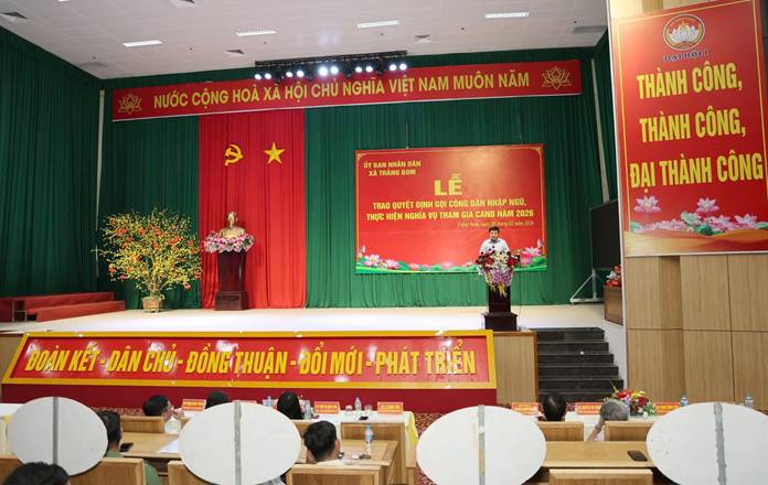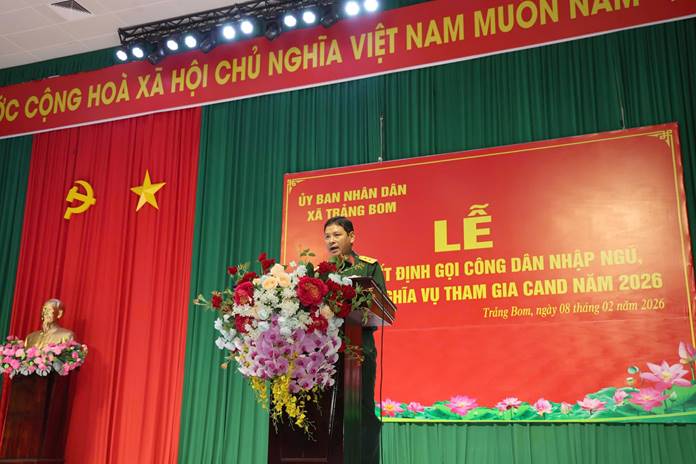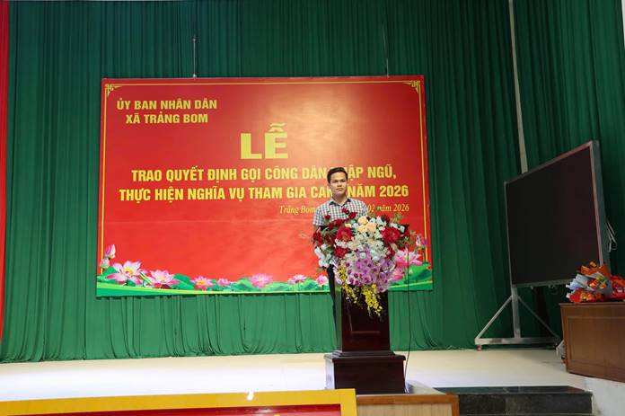 Phát biểu tại buổi lễ, đồng chí Lê Ngọc Tiên – Phó Bí thư Đảng ủy, Chủ tịch UBND xã, Chủ tịch Hội đồng NVQS xã đã biểu dương tinh thần tình nguyện và ý thức trách nhiệm của các thanh niên. Đồng chí đề nghị các thanh niên sau khi nhận lệnh cần chủ động thu xếp công việc cá nhân, tiếp tục rèn luyện, giữ gìn sức khỏe, tu dưỡng đạo đức; chấp hành nghiêm các quy định về an toàn giao thông, để đến ngày lên đường nhập ngũ với tinh thần phấn khởi, sẵn sàng nhận và hoàn thành tốt nhiệm vụ thiêng liêng của Tổ quốc; thể hiện rõ ý chí, nghị lực của tuổi trẻ Trảng Bom, xứng đáng là thanh niên trong thời đại Hồ Chí Minh. Đồng chí cũng đề nghị cấp ủy, ban lãnh đạo các ấp tiếp tục quan tâm, tổ chức thăm hỏi, hỗ trợ, động viên tinh thần gia đình và các em thanh niên, nhằm bảo đảm đến ngày 04/03/2026, 100% thanh niên trúng tuyển của xã Trảng Bom lên đường nhập ngũ, góp phần để xã hoàn thành chỉ tiêu giao quân năm 2026 ở cả cấp xã và cấp tỉnh.