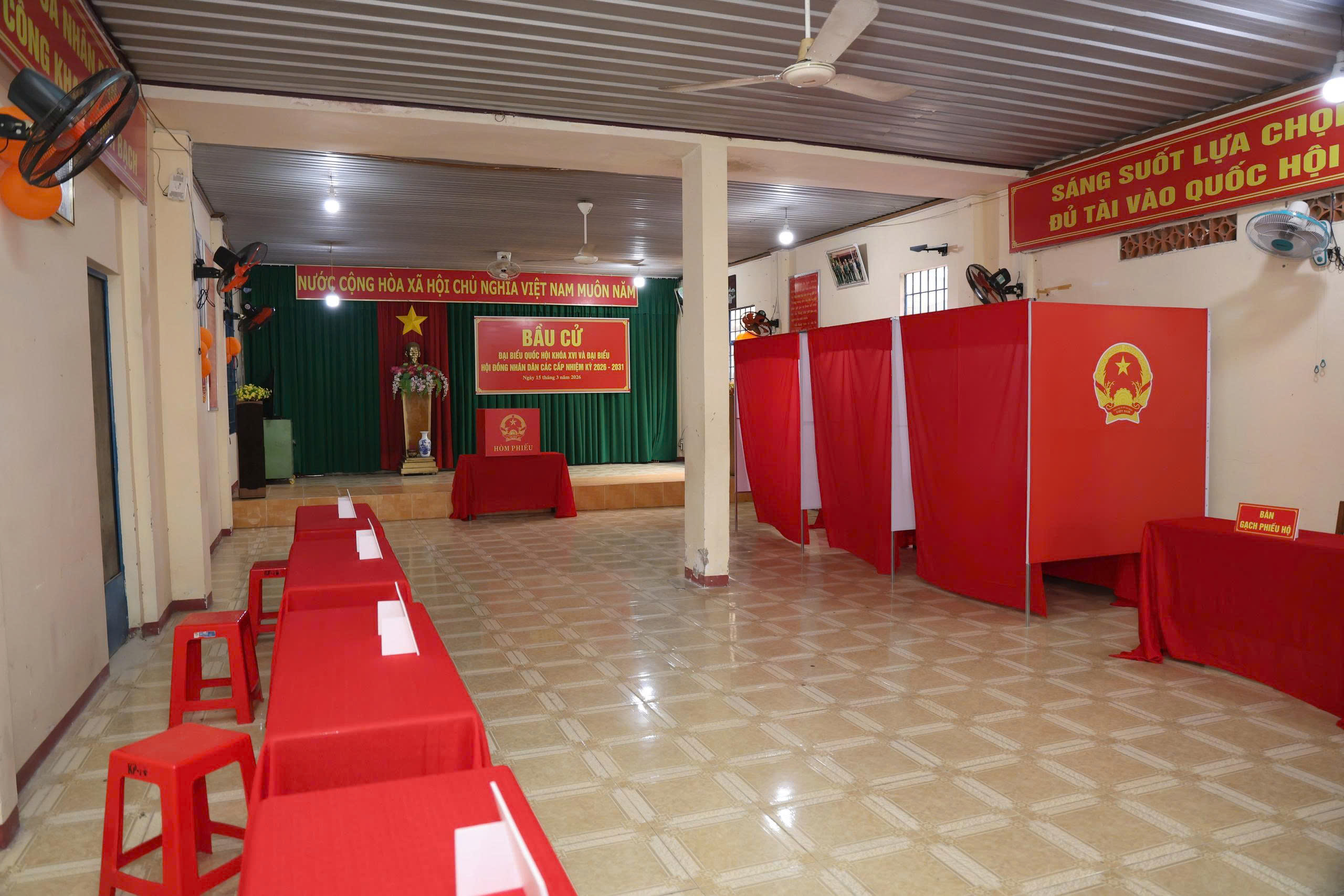 Đặc biệt, được bố trí khoa học, đảm bảo thuận tiện cho người dân tham gia bầu cử, đồng thời giữ vững nguyên tắc bỏ phiếu kín. Các pano, khẩu hiệu tuyên truyền về bầu cử đại biểu Quốc hội Việt Nam khóa XVI và đại biểu Hội đồng nhân dân các cấp nhiệm kỳ 2026–2031 được treo, dán nổi bật, đúng quy cách.