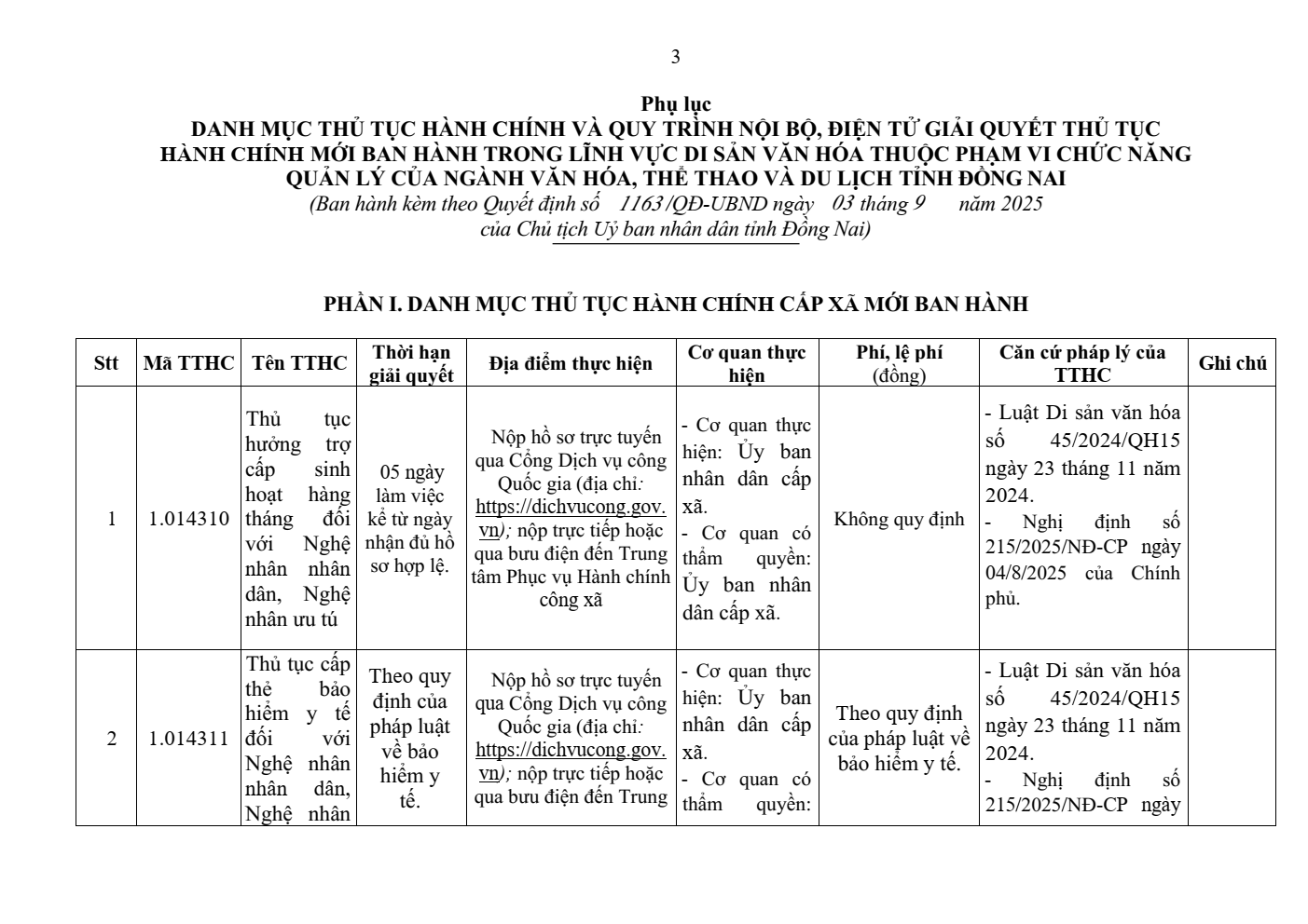 Ngày 03/9/2025, Chủ tịch UBND tỉnh Đồng Nai ban hành Quyết định số 1163/QĐ-UBND về việc công bố danh mục thủ tục hành chính và quy trình nội bộ, điện tử giải quyết thủ tục hành chính mới ban hành trong lĩnh vực di sản văn hóa thuộc phạm vi chức năng quản lý của ngành Văn hóa, Thể thao và Du lịch tỉnh Đồng Nai.
