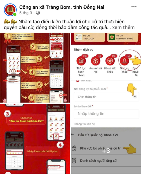 Trong trường hợp thông tin chưa chính xác hoặc có thay đổi nơi cư trú, cử tri cũng được hướng dẫn thực hiện các bước đề nghị điều chỉnh, thay đổi khu vực bỏ phiếu trên ứng dụng VNeID, giúp cơ quan chức năng kịp thời cập nhật, đảm bảo quyền bầu cử của công dân theo đúng quy định. Việc triển khai hướng dẫn này được thực hiện thông qua nhiều hình thức như đăng tải bài viết, video hướng dẫn trên Trang thông tin điện tử, mạng xã hội của địa phương, đồng thời tuyên truyền qua hệ thống loa truyền thanh và các nhóm Zalo cộng đồng.