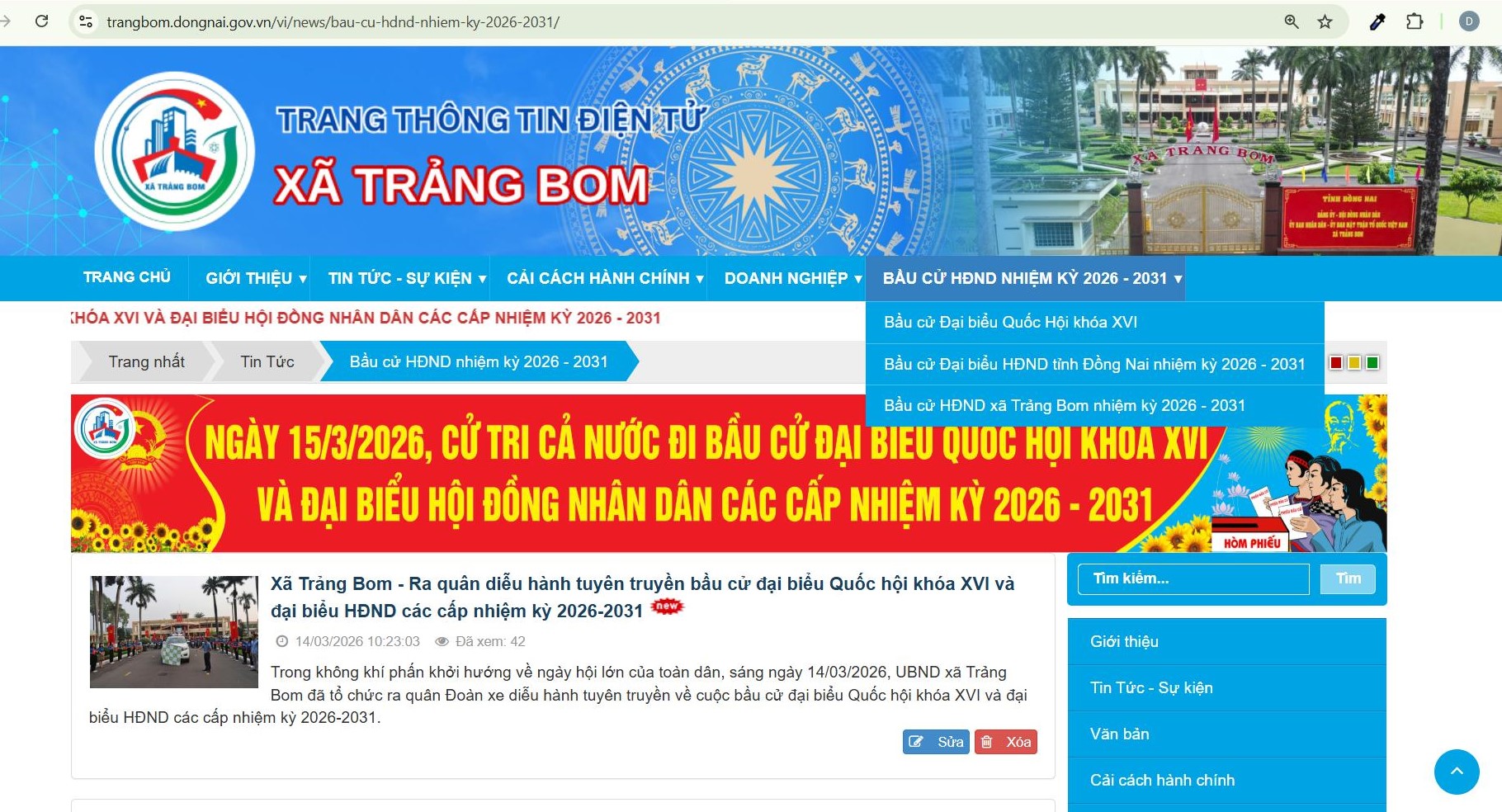 Ban Biên tập Trang thông tin điện tử xã Trảng Bom đã chủ động xây dựng chuyên mục riêng về bầu cử nhằm cung cấp thông tin chính thống, đầy đủ và kịp thời đến cử tri. Trong đó, chuyên mục được thiết kế với 03 chuyên mục con, gồm: “Bầu cử Đại biểu Quốc hội khóa XVI”, “Bầu cử Hội đồng nhân dân tỉnh Đồng Nai nhiệm kỳ 2026 – 2031” và “Bầu cử Hội đồng nhân dân xã Trảng Bom nhiệm kỳ 2026 – 2031”. Đồng thời, các chuyên mục này còn được liên kết trực tiếp với chuyên trang thông tin bầu cử Đại biểu Quốc hội khóa XVI và chuyên trang thông tin bầu cử của tỉnh Đồng Nai, giúp cử tri dễ dàng theo dõi, tra cứu thông tin về bầu cử ở cả ba cấp: Trung ương, tỉnh và địa phương một cách thuận tiện, nhanh chóng.