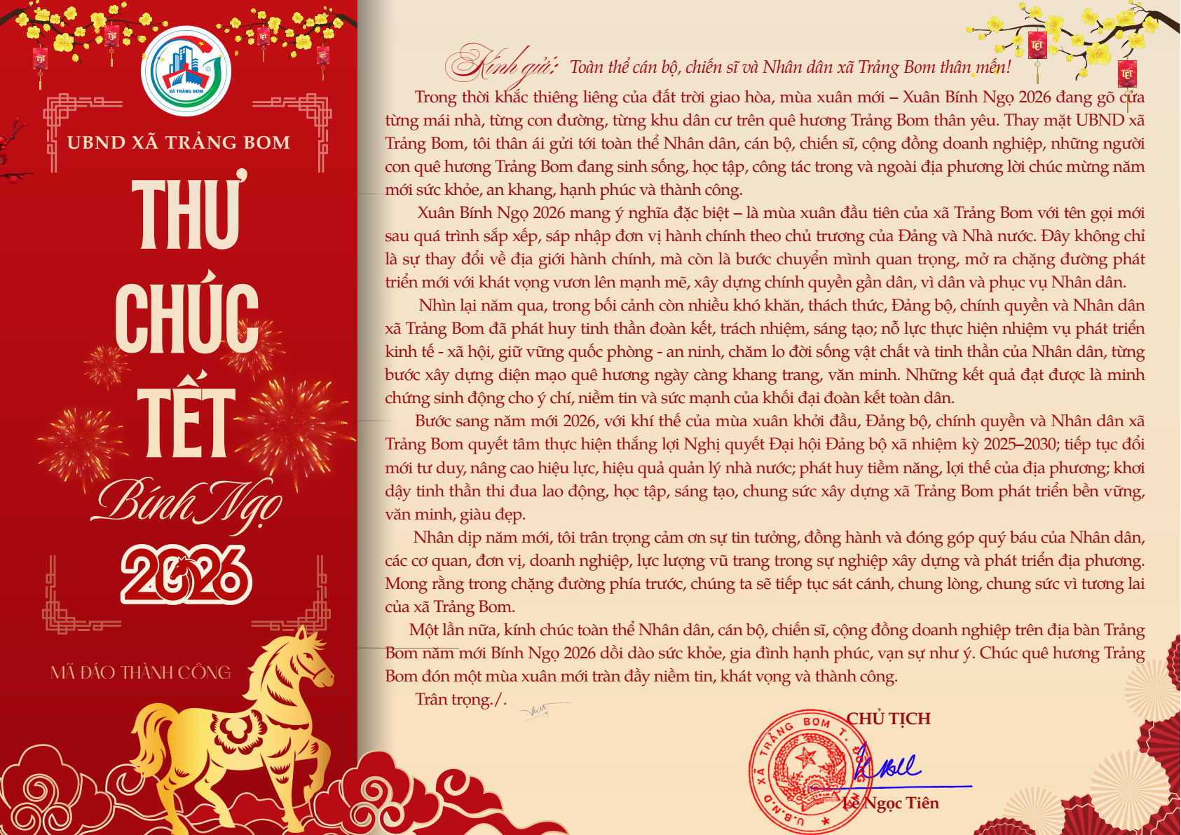 Trong thời khắc thiêng liêng của đất trời giao hòa, mùa xuân mới – Xuân Bính Ngọ 2026 đang gõ cửa từng mái nhà, từng con đường, từng khu dân cư trên quê hương Trảng Bom. Thay mặt UBND xã Trảng Bom, Chủ tịch Lê Ngọc Tiên gửi thư chúc Tết tới toàn thể Nhân dân, cán bộ, chiến sĩ, cộng đồng doanh nghiệp, những người con quê hương Trảng Bom đang sinh sống, học tập, công tác trong và ngoài xã.