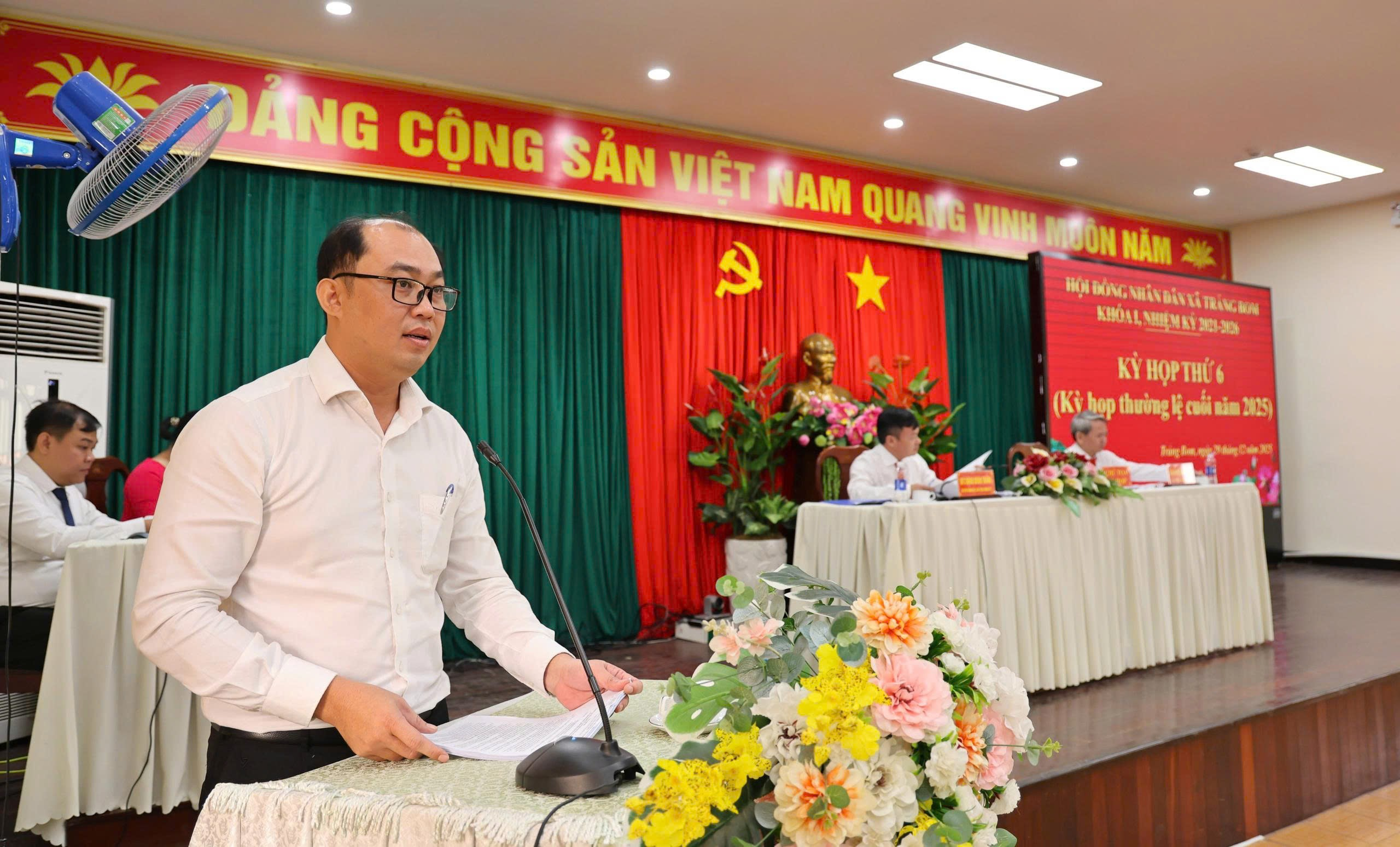 Trên cơ sở các báo cáo, tờ trình và ý kiến thảo luận tại kỳ họp, Hội đồng nhân dân xã đã thống nhất biểu quyết thông qua 06 nghị quyết quan trọng bao gồm: Nghị quyết về về điều chỉnh, bổ sung dự toán thu, chi ngân sách địa phương đợt 3 năm 2025; Nghị quyết về mục tiêu, nhiệm vụ và các giải pháp chủ yếu phát triển KTXH-QPAN giai đoạn 2026 – 2030; Nghị quyết về về mục tiêu, nhiệm vụ, giải pháp phát triển KTXH-QPAN năm 2026; Nghị quyết về dự toán thu ngân sách nhà nước - chi ngân sách địa phương năm 2026; Nghị quyết về kế hoạch đầu tư công năm 2026; Nghị quyết về chương trình giám sát của HĐND xã Trảng Bom năm 2026.