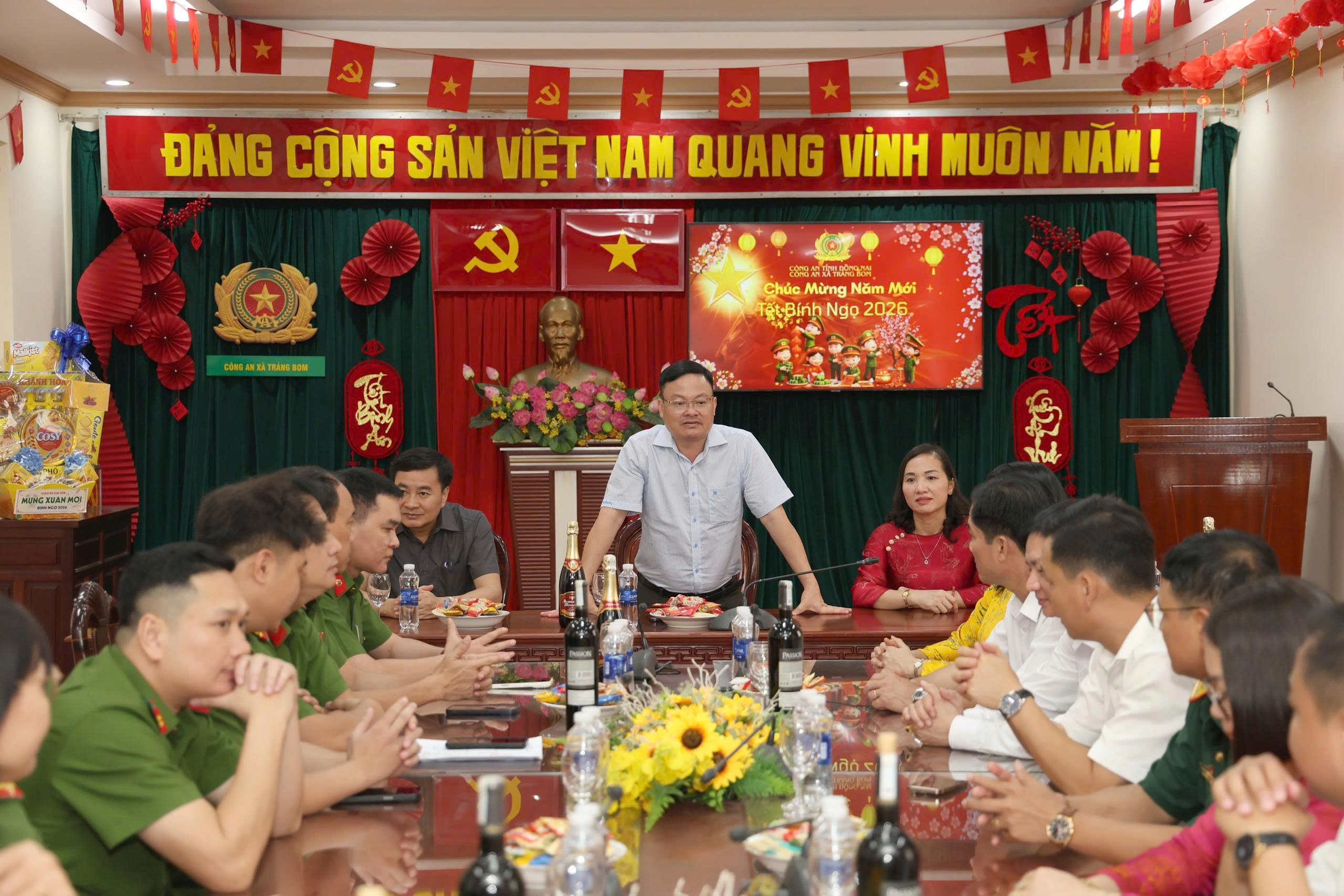 Tiếp đó, Đoàn đã đến thăm cán bộ, chiến sĩ Công an xã Trảng Bom. Báo cáo với Đoàn, chỉ huy đơn vị cho biết lực lượng đã triển khai 100% quân số trực đêm Giao thừa, tăng cường tuần tra kiểm soát để phòng chống tội phạm và các vi phạm về pháo nổ. Lãnh đạo UBND xã ghi nhận những nỗ lực của lực lượng Công an trong việc giữ vững an ninh chính trị, trật tự an toàn xã hội suốt năm qua. Đồng thời, chúc các cán bộ, chiến sĩ nhiều sức khỏe, hoàn thành xuất sắc nhiệm vụ giữ gìn sự bình yên cho nhân dân vui xuân, đón Tết.