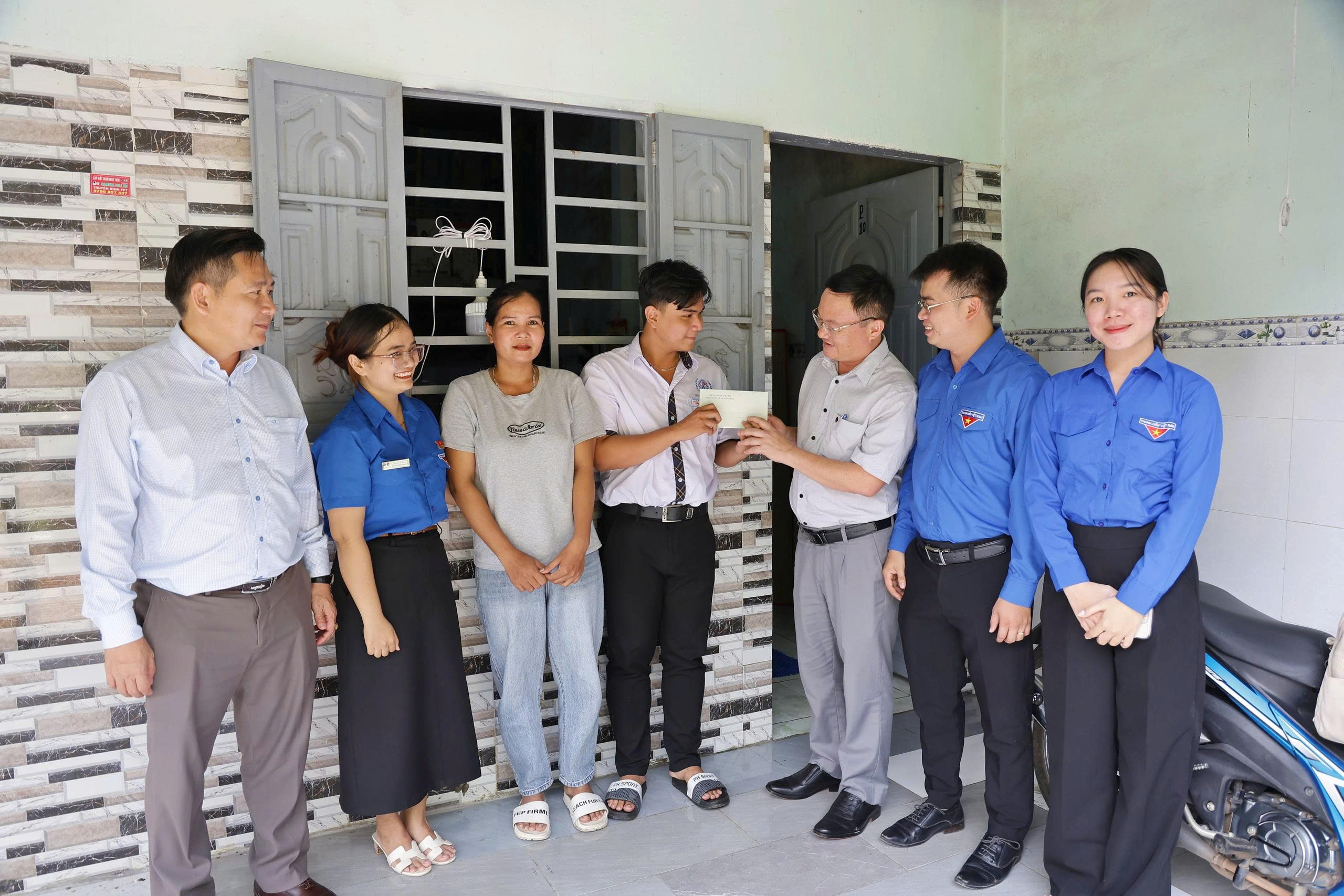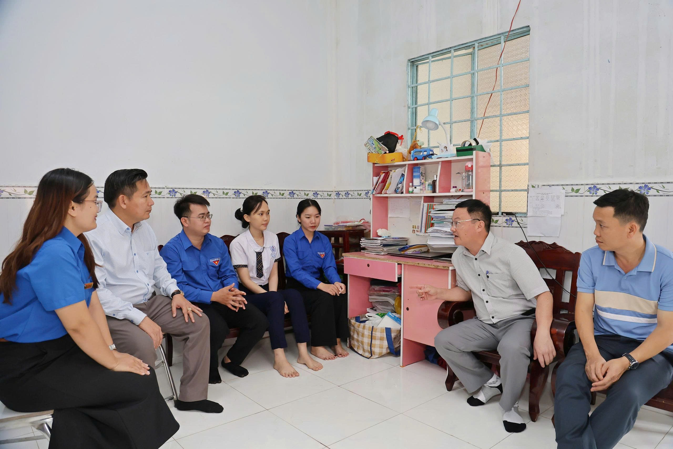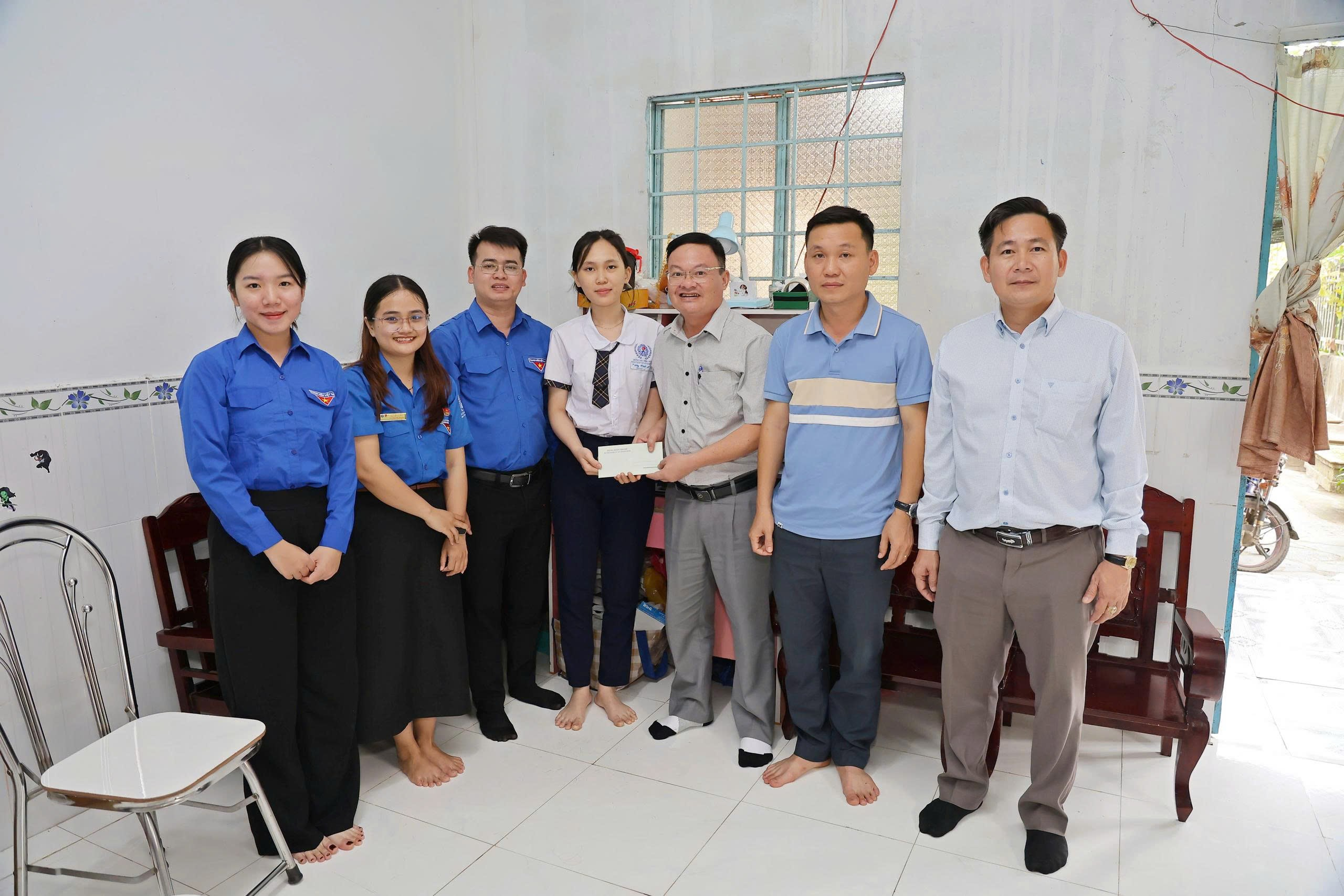 Cũng trong chuyến đi, Đoàn đã đến thăm em Vũ Thị Băng Châu – học sinh lớp 11A1, hiện ở ấp Quảng Phát. Châu là học sinh giỏi nhiều năm liền. Hoàn cảnh gia đình em rất khó khăn khi bố bỏ đi nhiều năm, mẹ một mình nuôi 3 chị em, phải ở nhờ nhà bà ngoại. Ngoài giờ học, Châu phụ mẹ chăm sóc các em và nhận thêm việc làm để phụ giúp trang trải sinh hoạt và chi phí học tập.