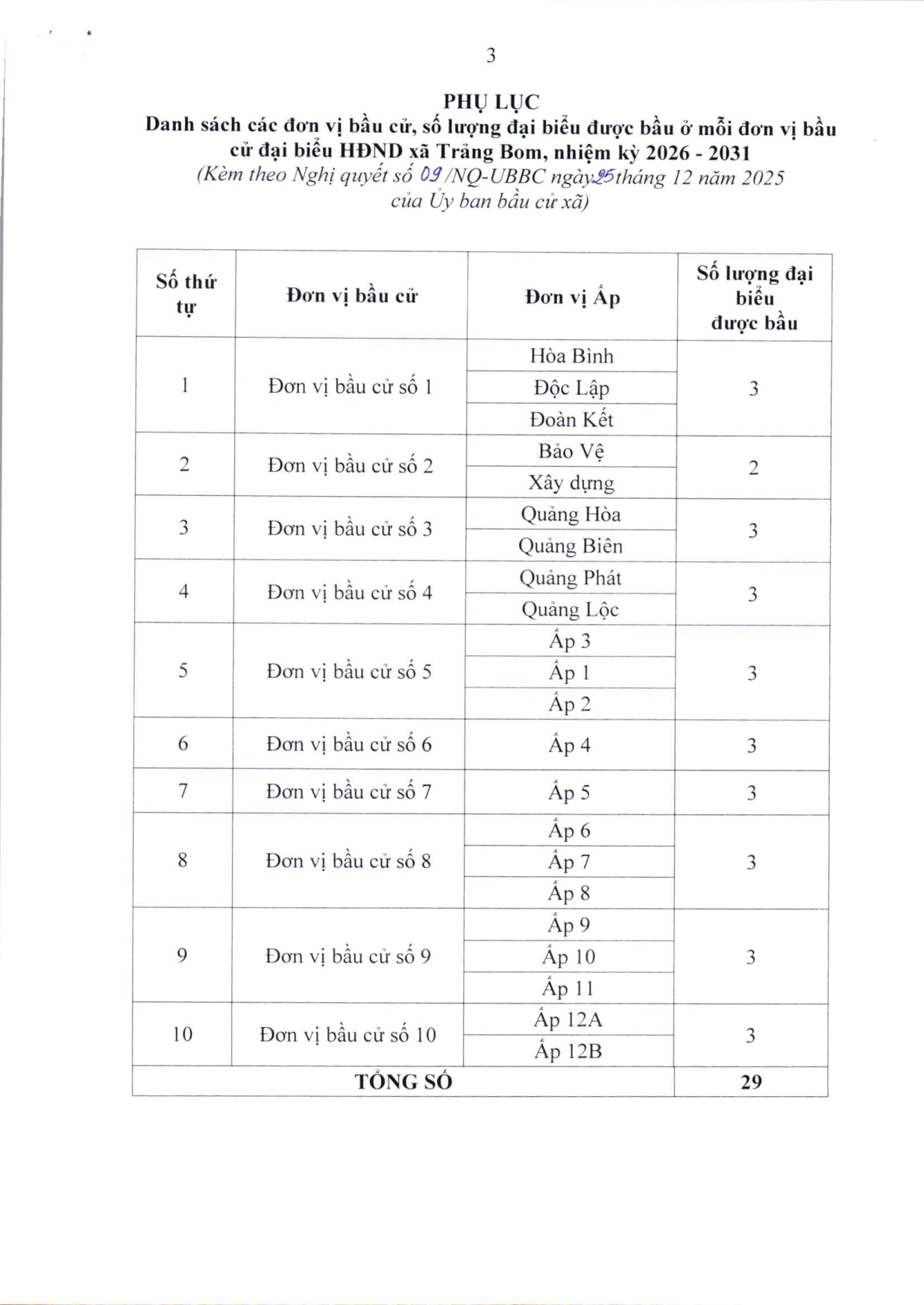 Tổng số đại biểu HĐND xã Trảng Bom nhiệm kỳ 2026–2031 được bầu ở 10 đơn vị bầu cử là 29 đại biểu.