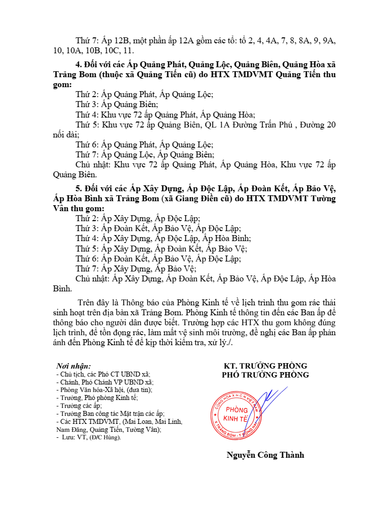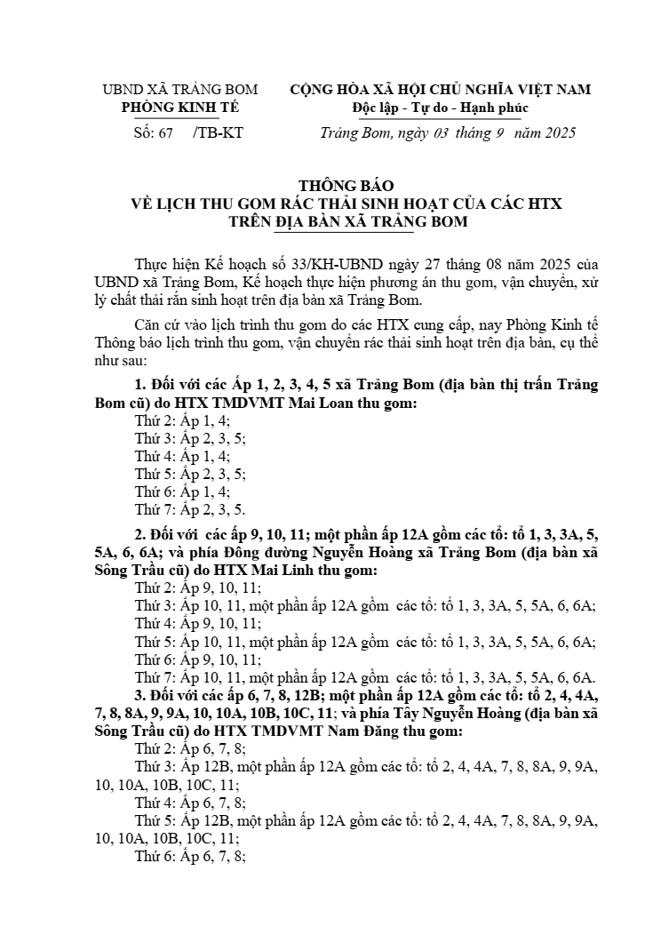 Thông báo của Phòng Kinh tế xã Trảng Bom về lịch thu gom rác thải sinh hoạt của các HTX trên địa bàn xã.