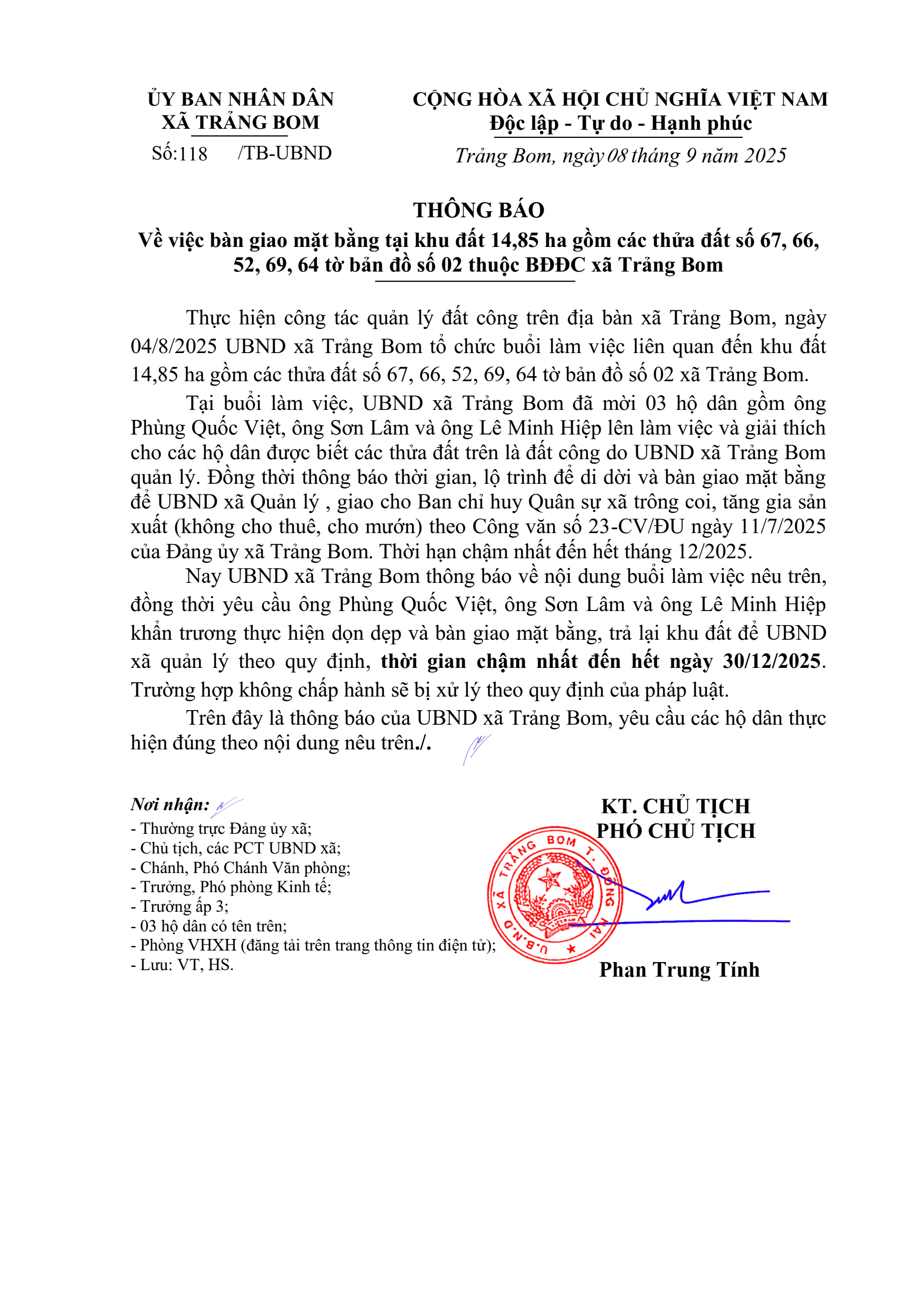 UBND xã Trảng Bom ban hành thông báo số 118/TB-UBND ngày 08/09/2025 về việc bàn giao mặt bằng khu đất 14,85 ha gồm các thửa đất số 67, 66, 52, 69, 64 tờ bản đồ số 02 thuộc BĐĐC xã Trảng Bom.