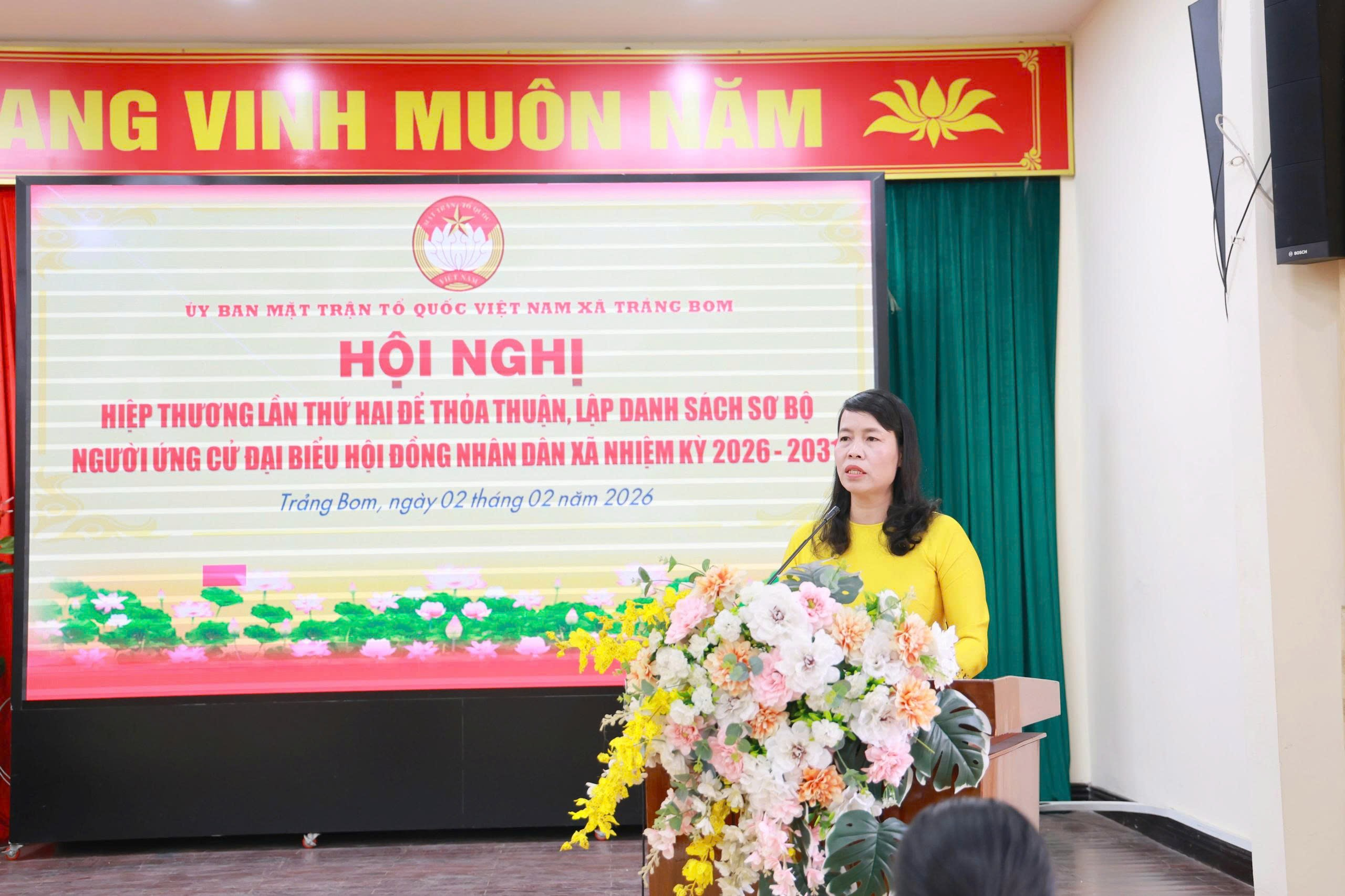 Phát biểu kết luận hội nghị, bà Trần Thị Hồng Thảo – Uỷ viên Ban Thường vụ Đảng uỷ - Chủ tịch Uỷ ban Mặt trận Tổ quốc Việt Nam xã Trảng Bom nhấn mạnh: Hội nghị hiệp thương lần thứ 2 được tổ chức nghiêm túc, dân chủ, đúng quy trình, thể hiện sự chuẩn bị chu đáo của địa phương cho cuộc bầu cử đại biểu HĐND nhiệm kỳ mới. Việc thống nhất danh sách những người được giới thiệu ứng cử đại biểu hội đồng nhân dân xã Trảng Bom, nhiệm kỳ 2026-2031 là cơ sở quan trọng để tiếp tục thực hiện các bước tiếp theo. Bên cạnh đó, các đơn vị, các ấp cần đẩy mạnh công tác tuyên truyền về bầu cử trên các kênh thông tin, kịp thời nắm bắt dư luận xã hội để xử lý, định hướng phù hợp hướng tới cuộc bầu cử dân chủ, công khai, minh bạch, lựa chọn đúng những đại biểu xứng đáng đại diện cho Nhân dân trong giai đoạn phát triển mới của địa phương.