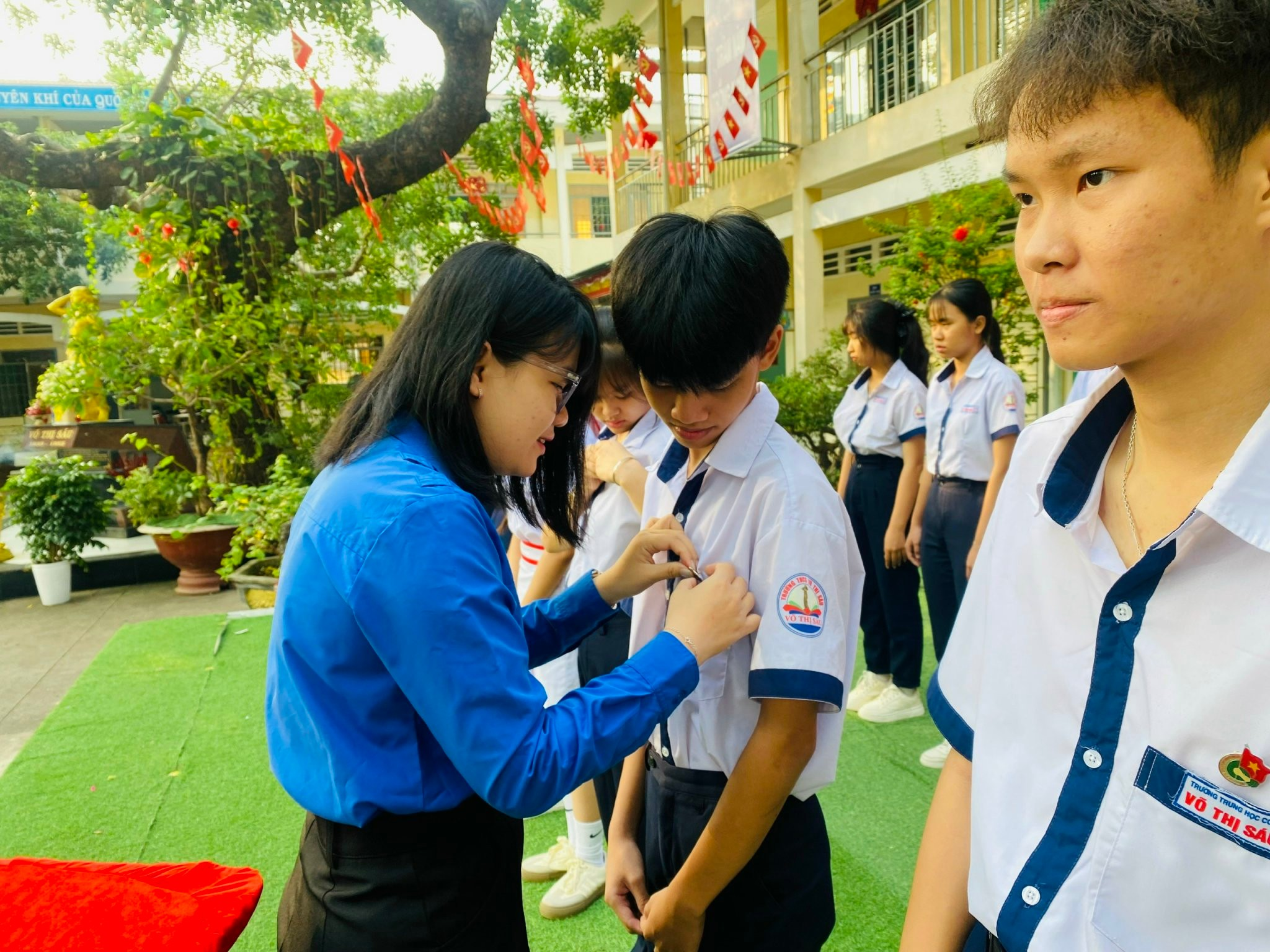 Đ/c Hoàng Thảo Trâm – Phó Bí thư Đoàn xã, Chủ tịch Hội đồng Đội xã dự và trao huy hiệu đoàn cho đoàn viên mới kết nạp tại trường THCS Võ Thị Sáu