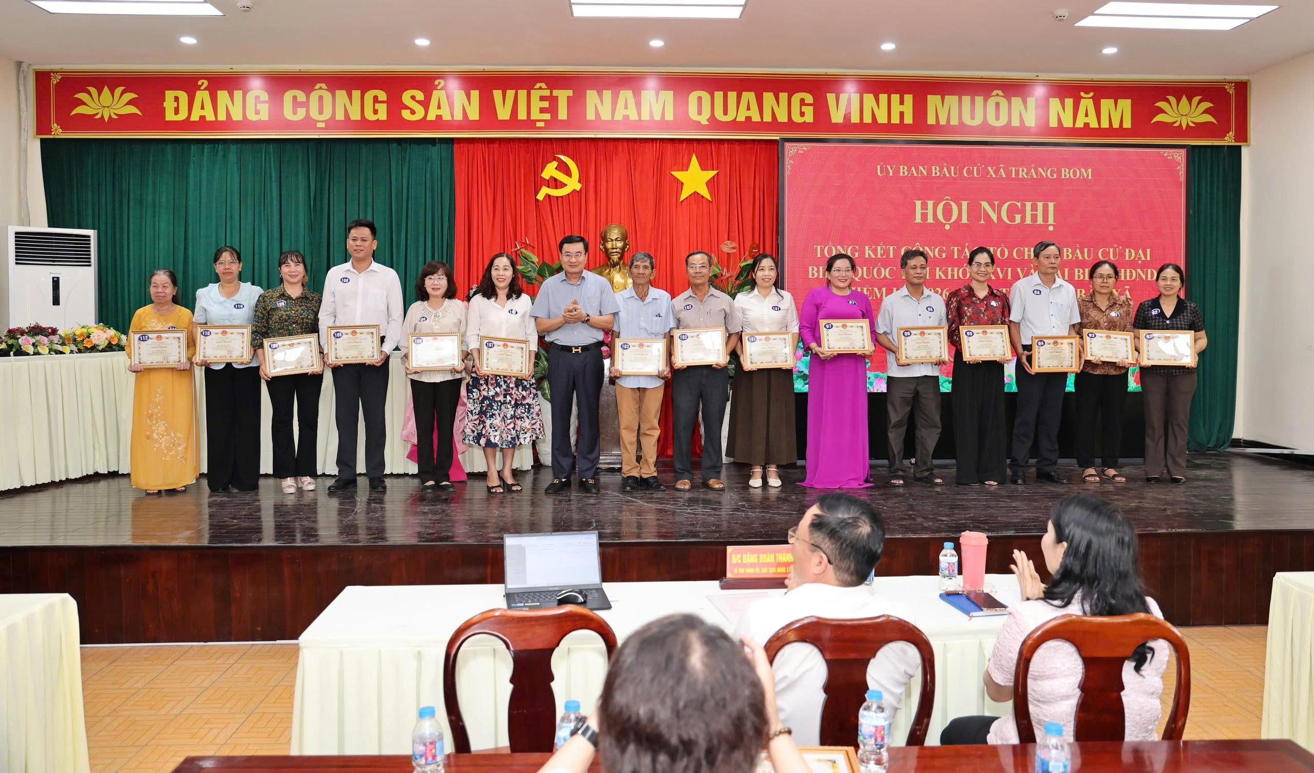 <figure class="image"><img style="aspect-ratio:818/484;" src="https://trangbom.dongnai.gov.vn/uploads/trangbom/news/2026_04/image_11.png" width="818" height="484" /><figcaption><i>Các đại biểu tham dự hội nghị</i></figcaption></figure><p style="text-align:justify;">Tham dự hội nghị có các đồng chí: đồng chí Đặng Doãn Thành – Bí thư Đảng uỷ; đồng chí Lê Ngọc Tiên – Phó Bí thư Đảng uỷ, Chủ tịch UBND xã; đồng chí Trần Thị Hồng Thảo – UVBTV Đảng uỷ, Chủ tịch UBMTTQVN xã; các đồng chí trong Ban Thường vụ Đảng uỷ, Ban Chấp hành Đảng bộ xã; các đồng chí lãnh đạo đại diện các cơ quan, ban, ngành, đoàn thể xã; các đồng chí thành viên Ban chỉ đạo bầu cử, Ủy ban bầu cử xã; thành viên các Tiểu ban phục vụ công tác bầu cử xã; trưởng, phó các Ban bầu cử và các Tổ bầu cử xã; Bí thư, trưởng ấp, trưởng Ban công tác mặt trận các ấp và các tập thể, cá nhân được khen thưởng.&nbsp;</p><figure class="image"><img style="aspect-ratio:818/512;" src="https://trangbom.dongnai.gov.vn/uploads/trangbom/news/2026_04/image_12.png" width="818" height="512" /><figcaption><i>Toàn cảnh hội nghị</i></figcaption></figure><p style="text-align:justify;">Theo báo cáo của Uỷ ban bầu cử xã Trảng Bom với sự vào cuộc đồng bộ của cả hệ thống chính trị, sự phối hợp chặt chẽ giữa các cơ quan, đơn vị cùng sự hưởng ứng tích cực của các tầng lớp nhân dân, cuộc bầu cử<strong>&nbsp;</strong>đại biểu Quốc hội khóa XVI và đại biểu HĐND các cấp nhiệm kỳ 2026 - 2031 trên địa bàn xã đã diễn ra thành công, bảo đảm dân chủ, đúng pháp luật, an toàn, tiết kiệm và thực sự trở thành ngày hội của toàn dân.&nbsp;</p><p style="text-align:justify;">Ngay sau khi tiếp nhận các chỉ đạo của cấp trên, Ủy ban bầu cử xã Trảng Bom đã chủ động, kịp thời ban hành hệ thống văn bản thuộc thẩm quyền để tổ chức thực hiện. Các văn bản đảm bảo đúng trình tự, phù hợp thực tiễn, làm cơ sở vững chắc cho các đơn vị, tổ chức phụ trách công tác bầu cử triển khai đồng bộ và thống nhất. Ủy ban bầu cử xã thường xuyên đôn đốc, kiểm tra để đảm bảo mọi nhiệm vụ đều đạt chất lượng và tiến độ đề ra.</p><p style="text-align:justify;">Toàn xã đã ấn định 10 đơn vị bầu cử, thành lập 10 Ban bầu cử tại các đơn vị và 28 Tổ bầu cử tương ứng với 28 khu vực bỏ phiếu. Việc phân chia khu vực bỏ phiếu được tính toán khoa học, phù hợp đặc điểm dân cư, tạo điều kiện thuận lợi nhất cho cử tri tham gia thực hiện quyền công dân.</p><p style="text-align:justify;">Điều đáng mừng, trên địa bàn xã có 99,49% cử tri tham gia bỏ phiếu bầu đại biểu Quốc hội, Hội đồng nhân dân tỉnh và 99,56% cử tri đi bầu đại biểu Hội đồng nhân dân xã. Kết quả, 29 đại biểu đã trúng cử vào Hội đồng nhân dân xã khóa II, nhiệm kỳ 2026 - 2031. Cơ cấu đại biểu đảm bảo tính đại diện cao: tỷ lệ nữ đạt 17,24%, đại biểu trẻ tuổi đạt 17,24% và đại biểu tái cử chiếm 62,02%. Đáng chú ý, 100% đại biểu trúng cử đều có trình độ chuyên môn từ Đại học và sau Đại học trở lên.</p><p style="text-align:justify;">Toàn xã không có khu vực nào phải tổ chức bầu cử lại do tỷ lệ cử tri thấp, cũng không có nơi phải bầu thêm hoặc bị hủy kết quả vì vi phạm. Công tác tuyên truyền được thực hiện hiệu quả, tạo không khí dân chủ, sôi nổi trong nhân dân. Các lực lượng chức năng đảm bảo tốt an ninh trật tự, không phát sinh điểm nóng hay khiếu nại.&nbsp;</p><figure class="image"><img style="aspect-ratio:817/480;" src="https://trangbom.dongnai.gov.vn/uploads/trangbom/news/2026_04/image.jpeg" width="817" height="480" /><figcaption><i>Đồng chí Đặng Doãn Thành – Bí thư Đảng uỷ, Trưởng Ban chỉ đạo công tác bầu cử xã phát biểu</i></figcaption></figure><p style="text-align:center;">&nbsp;</p><p style="text-align:justify;">&nbsp;</p><p style="text-align:justify;">Phát biểu tại hội nghị, đồng chí Đặng Doãn Thành – Bí thư Đảng uỷ, Trưởng Ban chỉ đạo công tác bầu cử xã nhấn mạnh: cuộc bầu cử trên địa bàn xã Trảng Bom đã được tổ chức thành công tốt đẹp, đảm bảo đúng quy định của pháp luật, dân chủ, an toàn và tiết kiệm. Theo quy định, số lượng đại biểu Hội đồng nhân dân cấp xã được bầu là 49 đại biểu; kết quả, đã bầu được 29 đại biểu trúng cử, bảo đảm tiêu chuẩn, cơ cấu, thành phần theo đúng quy định, thể hiện ý chí, nguyện vọng và niềm tin của nhân dân. Đạt được kết quả đó là nhờ sự lãnh đạo, chỉ đạo sâu sát của cấp trên; sự vào cuộc đồng bộ, trách nhiệm của cả hệ thống chính trị; sự nỗ lực, tận tâm của các cơ quan, đơn vị, các tổ chức phụ trách bầu cử và đặc biệt là sự hưởng ứng tích cực của cử tri toàn xã. Đồng chí ghi nhận và biểu dương các tập thể, cá nhân đã có nhiều đóng góp tích cực, trách nhiệm cao trong công tác bầu cử, góp phần quan trọng vào thành công chung của địa phương.&nbsp;</p><p style="text-align:justify;">Nhiệm vụ phía trước đặt ra cho các 