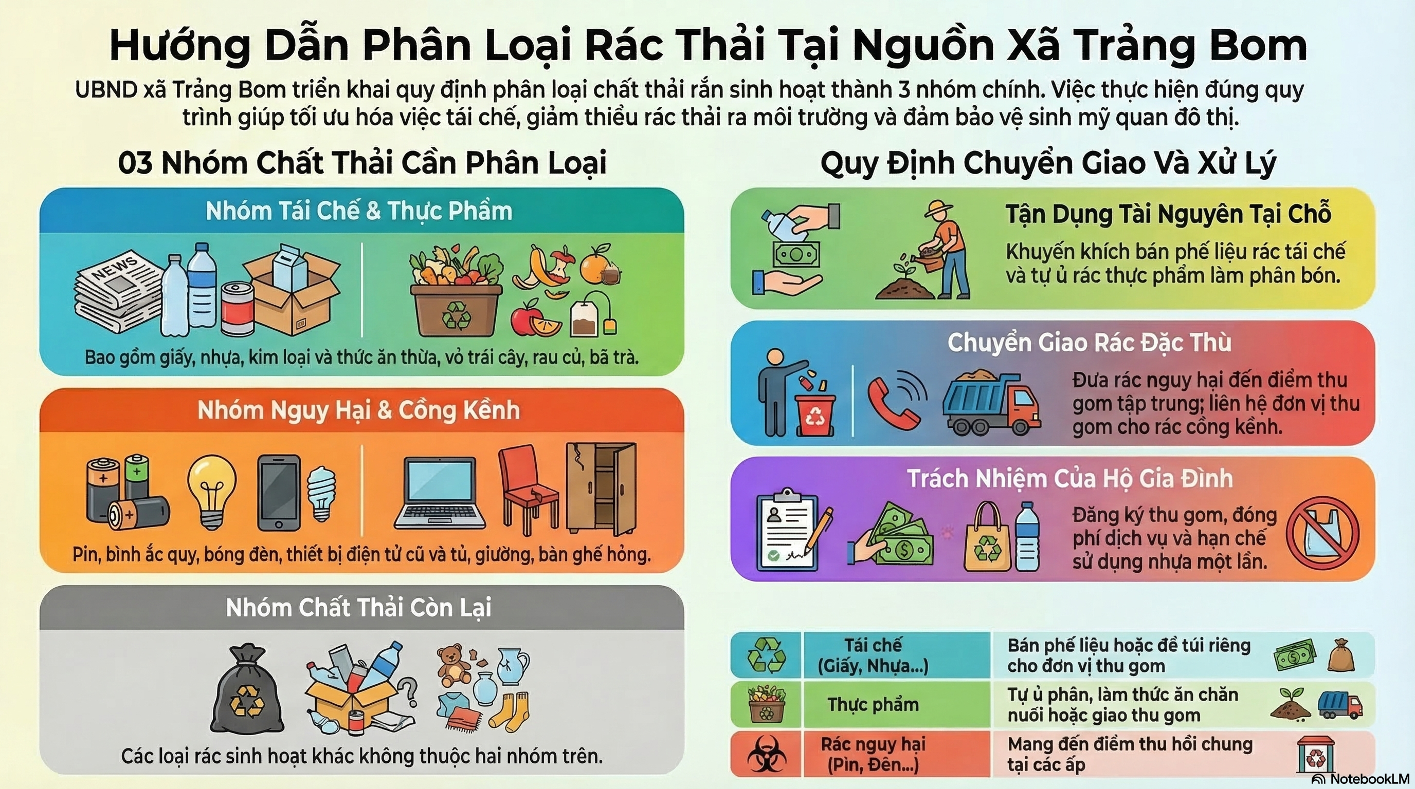 Thực hiện Kế hoạch số 16/KH-UBND ngày 10/01/2026 của Đảng ủy xã về việc thực hiện Chỉ thị số 02-CT/TU ngày 02/12/2025 của Tỉnh ủy Đồng Nai về tăng cường công tác lãnh đạo của cấp ủy Đảng đối với việc thực hiện phân loại chất thải rắn sinh hoạt tại nguồn và thu gom, vận chuyển, xử lý chất thải rắn sinh hoạt sau khi được phân loại trên địa bàn xã Trảng Bom. UBND xã Trảng Bom hướng dẫn quy định về phân loại chất thải rắn sinh hoạt tại nguồn.