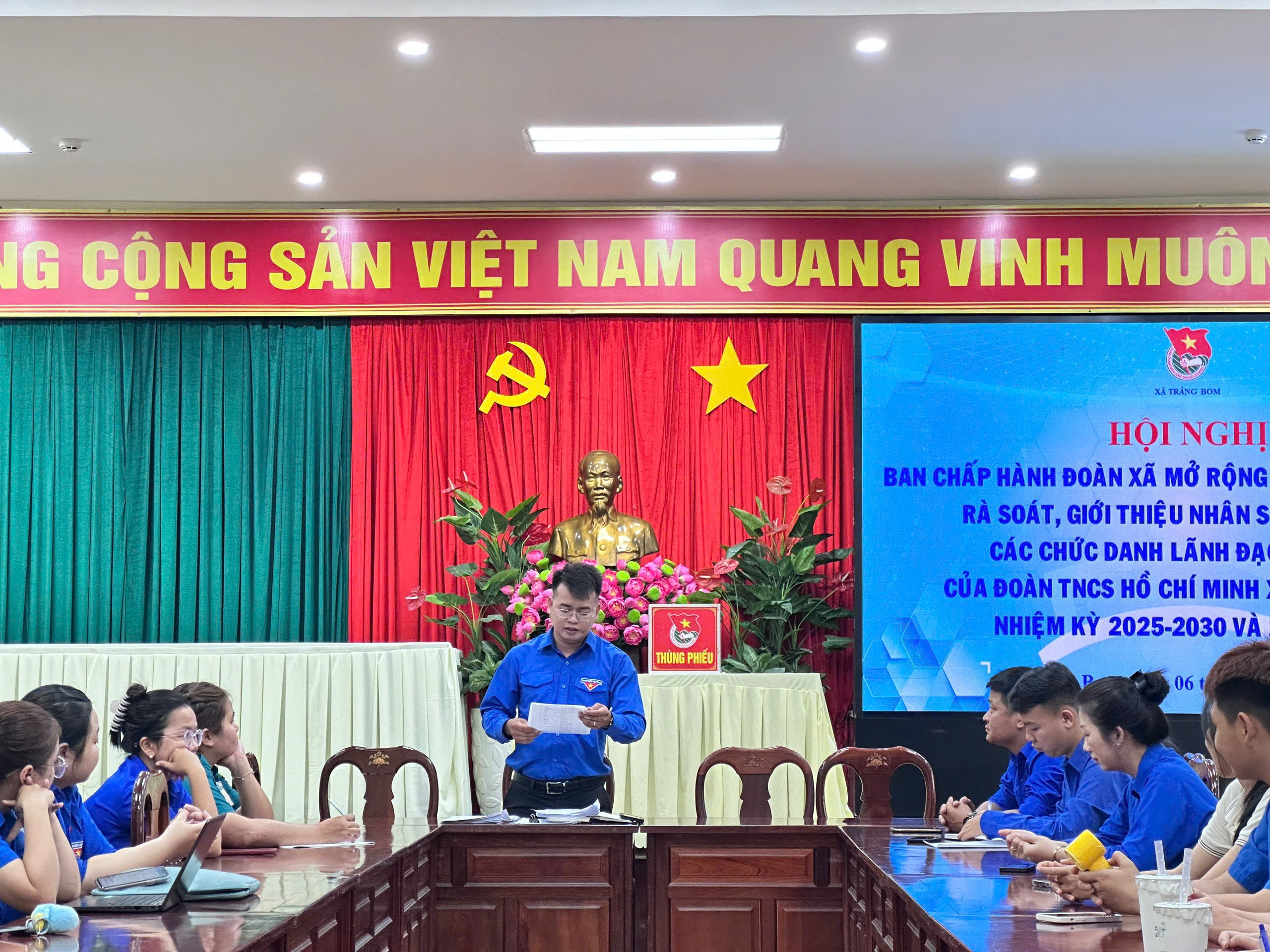 Ngày 06/4/2026, Ban Chấp hành Đoàn Thanh niên xã Trảng Bom đã tổ chức Hội nghị Ban Chấp hành mở rộng (không thường kỳ) nhằm rà soát, giới thiệu nhân sự quy hoạch các chức danh lãnh đạo, quản lý của Đoàn TNCS Hồ Chí Minh xã nhiệm kỳ 2025 – 2030 và nhiệm kỳ 2030 – 2035. Đ/c Lê Hoàng Phụng – UV.BCH Tỉnh đoàn, ĐUV, Bí thư Đoàn xã – Chủ trì Hội nghị, cùng dự có các đồng chí trong Ban Chấp hành Đoàn xã cùng đại biểu được triệu tập. Hội nghị được tổ chức trong không khí nghiêm túc, dân chủ, phát huy tinh thần trách nhiệm của từng đồng chí cán bộ Đoàn.