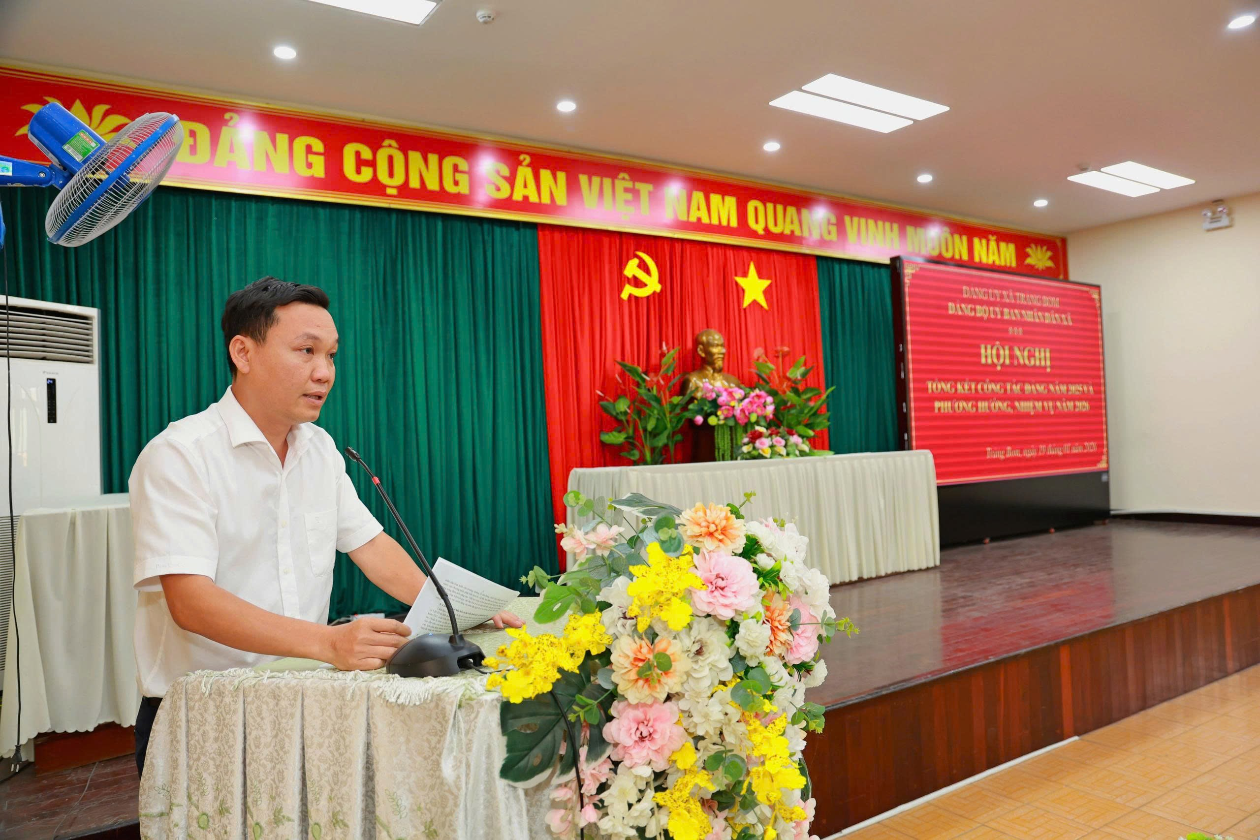 Phát biểu tại hội nghị, đồng chí Đặng Doãn Thành – Bí thư Đảng uỷ, chủ tịch HĐND xã Trảng Bom biểu dương những kết quả mà Đảng bộ UBND xã đạt được trong thời gian qua. Đồng thời đề nghị trong năm 2026 – năm đầu thực hiện các Nghị quyết, kế hoạch phát triển giai đoạn mới, Đảng bộ UBND xã cần tập trung ổn định tổ chức bộ máy và nâng cao chất lượng đội ngũ cán bộ theo mô hình chính quyền địa phương 2 cấp đảm bảo tinh gọn, hoạt động hiệu lực, hiệu quả. Chú trọng nâng cao chất lượng đội ngũ cán bộ, công chức, tăng cường kỷ luật về thi hành chính, đề cao trách nhiệm đạo đức công vụ và tinh thần phục vụ nhân dân; triển khai thực hiện tốt các chỉ tiêu nhiệm vụ phát triển kinh tế xã hội, nâng cao hiệu quả quản lý đất đai, tài nguyên, trật tự xây dựng quan tâm các lĩnh vực an sinh xã hội, giảm nghèo bền vững, giải quyết việc làm, nâng cao đời sống vật chất và tinh thần của nhân dân; Chủ động xây dựng kế hoạch, phương án cụ thể, bảo đảm tổ chức bầu cử đại biểu Quốc Hội khóa XVI và đại biểu hội đồng nhân dân nhiệm kỳ 2026-2031 đúng luật an toàn dân chủ, tiết kiệm, làm tốt công tác tuyên truyền, tạo sự đồng thuận cao trong nhân dân; đẩy mạnh chuyển đổi số gắn với cải cách hành chính, nâng cao chất lượng dịch vụ công trực tuyến, tăng tỷ lệ hồ sơ giải quyết trực tuyến, tiếp tục chuẩn hóa dữ liệu kết nối, chia sẻ dữ liệu dùng chung, đưa chuyển đổi số đi vào thực chất phục vụ trực tiếp người dân và doanh nghiệp; giữ vững quốc phòng, an ninh, trật tự, an toàn xã hội chủ động nắm chắc tình hình cơ sở, tăng cường các biện pháp bảo đảm an ninh chính trị, trật tự an toàn xã hội, kịp thời giải quyết các vụ việc, phát sinh ngay từ cơ sở, không để phát sinh điểm nóng, phức tạp kéo dài; tăng cường công tác xây dựng Đảng và phối hợp hệ thống chính trị thực hiện nghiêm nguyên tắc Đảng lãnh đạo, phát huy vai trò phối hợp với ủy ban MTTQVN và các đoàn thể, nâng cao chất lượng tham mưu cho Đảng ủy thực hiện tốt công tác kiểm tra, giám sát, phòng ngừa sai phạm trong thực thi công vụ.
