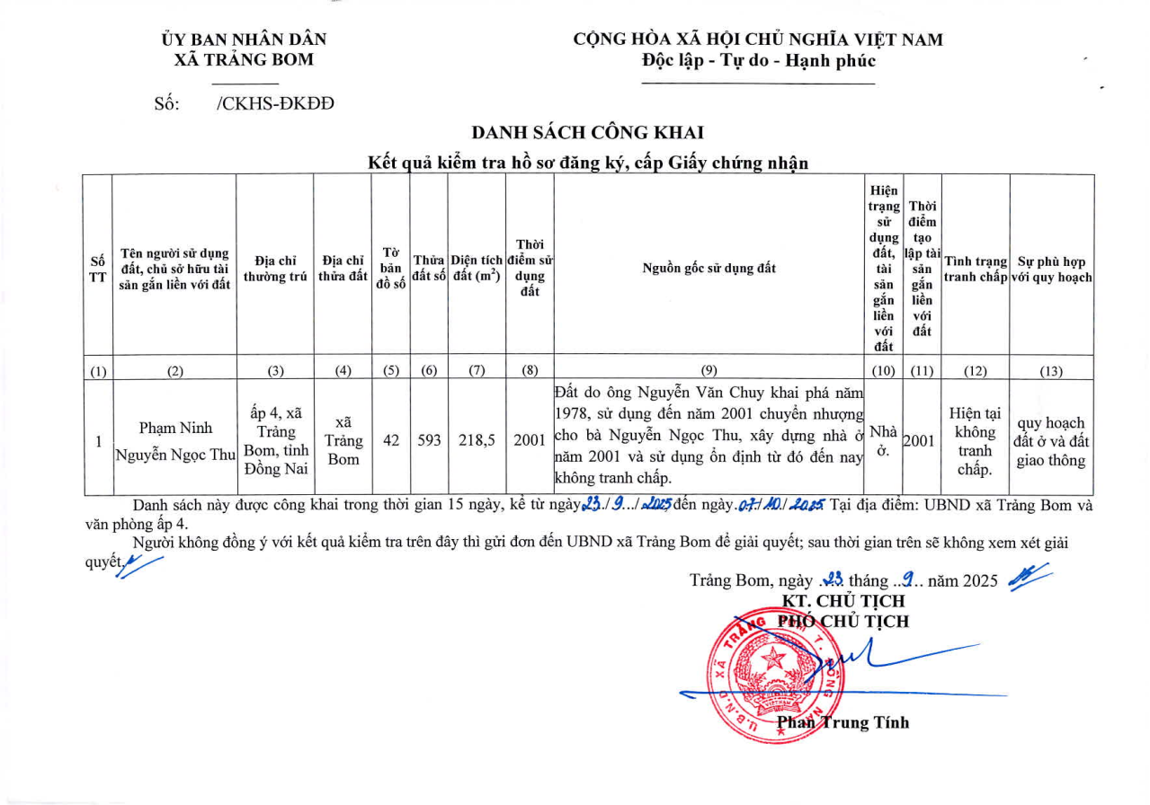 Nay UBND xã tổ chức thực hiện việc niêm yết công khai hồ sơ đăng ký xin cấp giấy chứng nhận quyền sử dụng đất quyền sở hữu nhà ở và tài sản gắn liền với đất lần đầu tại thửa đất số 593, tờ số 42, với diện tích 218,5m² đất ở, thuộc BĐĐC xã Trảng Bom của ông Phạm Ninh và bà Nguyễn Ngọc Thu tại các địa điểm sau: