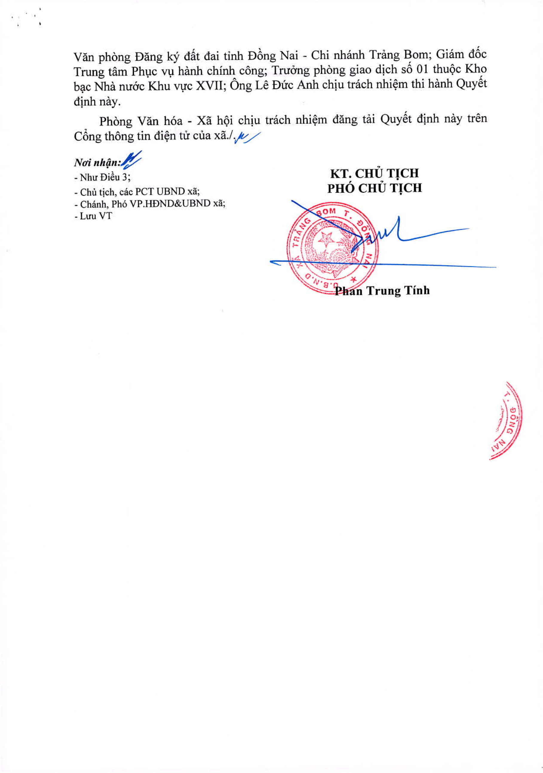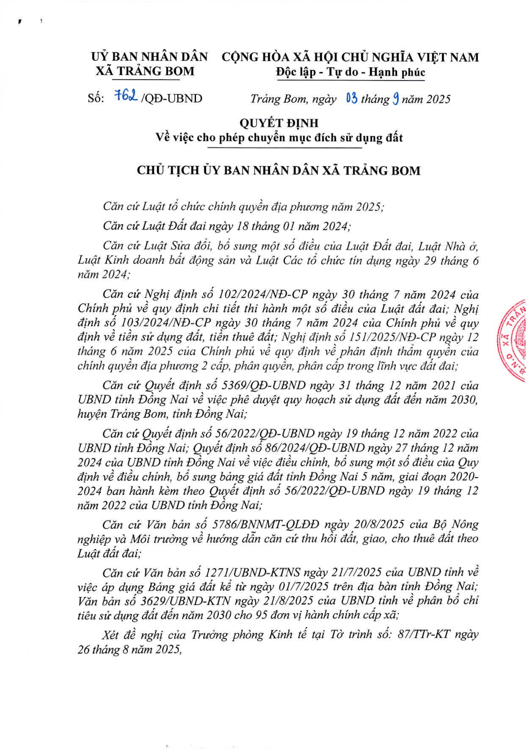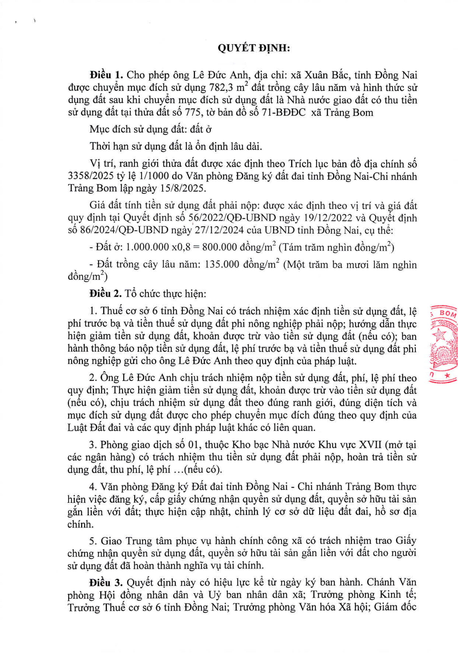 Ngày 03/9/2025, UBND xã Trảng Bom đã ban hành Quyết định số 762/QĐ-UBND về việc cho phép chuyển mục đích sử dụng đất đối với ông Lê Đức Anh (Thửa đất số 775, tờ bản đồ số 71).