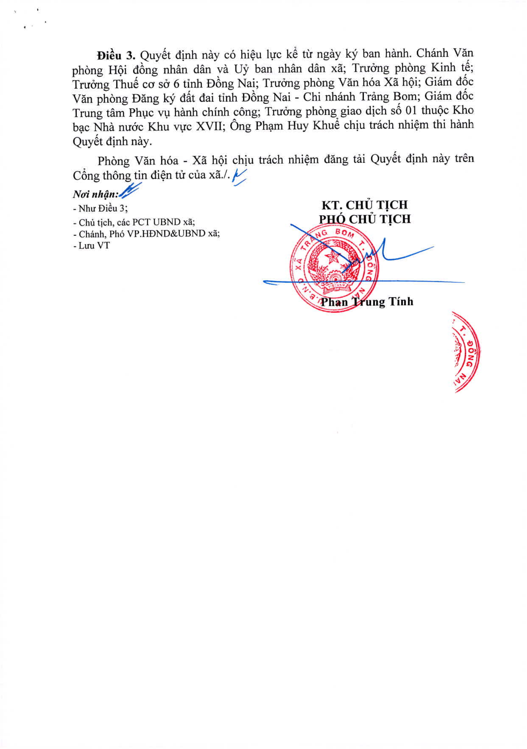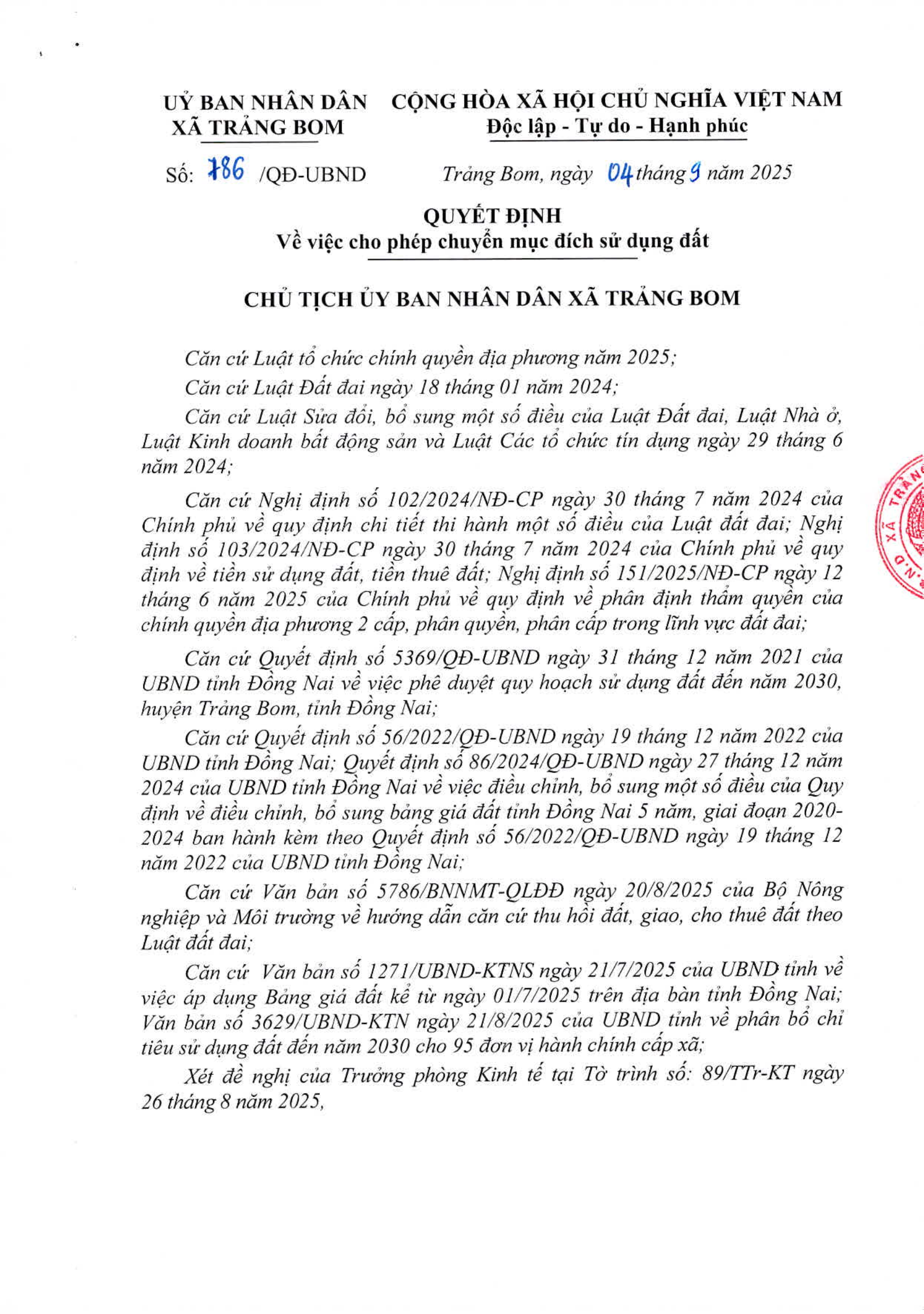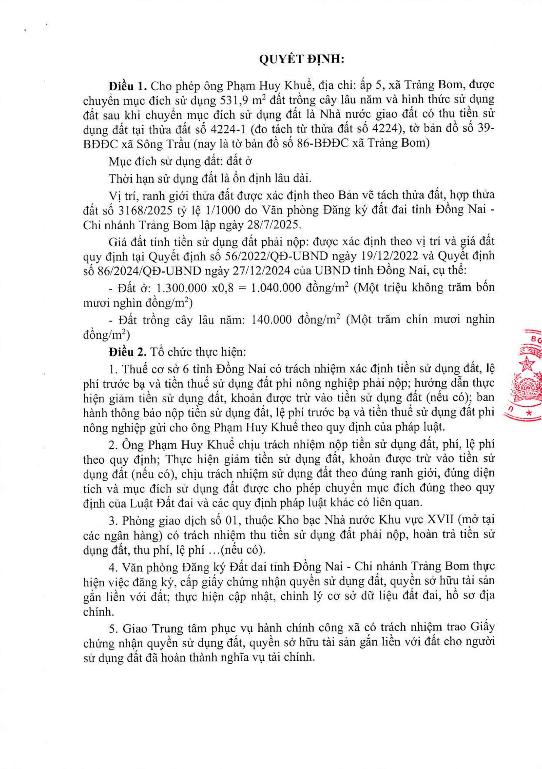 Ngày 04/9/2025, UBND xã Trảng Bom đã ban hành Quyết định số 786/QĐ-UBND về việc cho phép chuyển mục đích sử dụng đất đối với ông Phạm Huy Khuể (thửa đất số 4224-1, tờ bản đồ số 39).