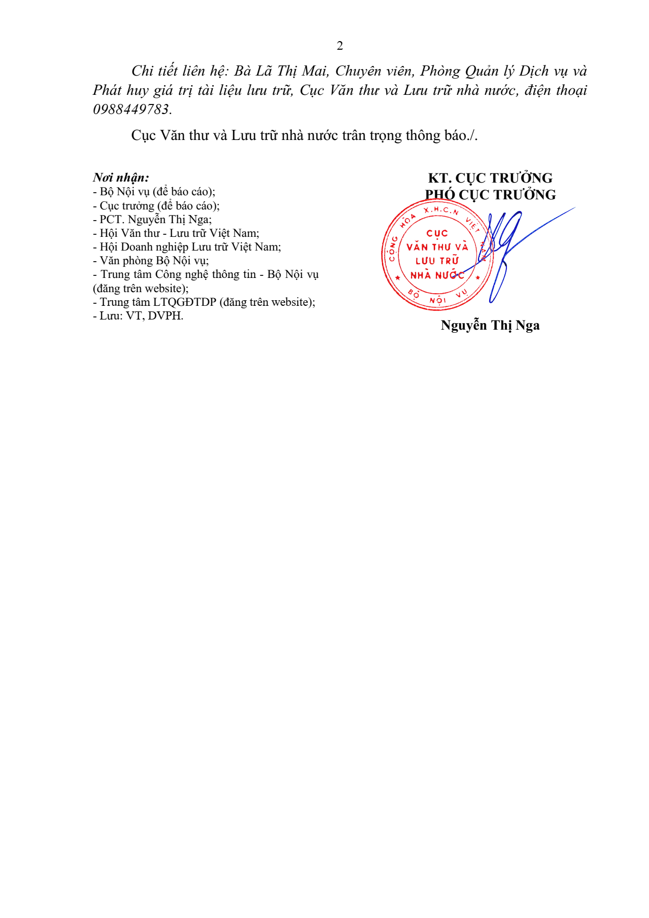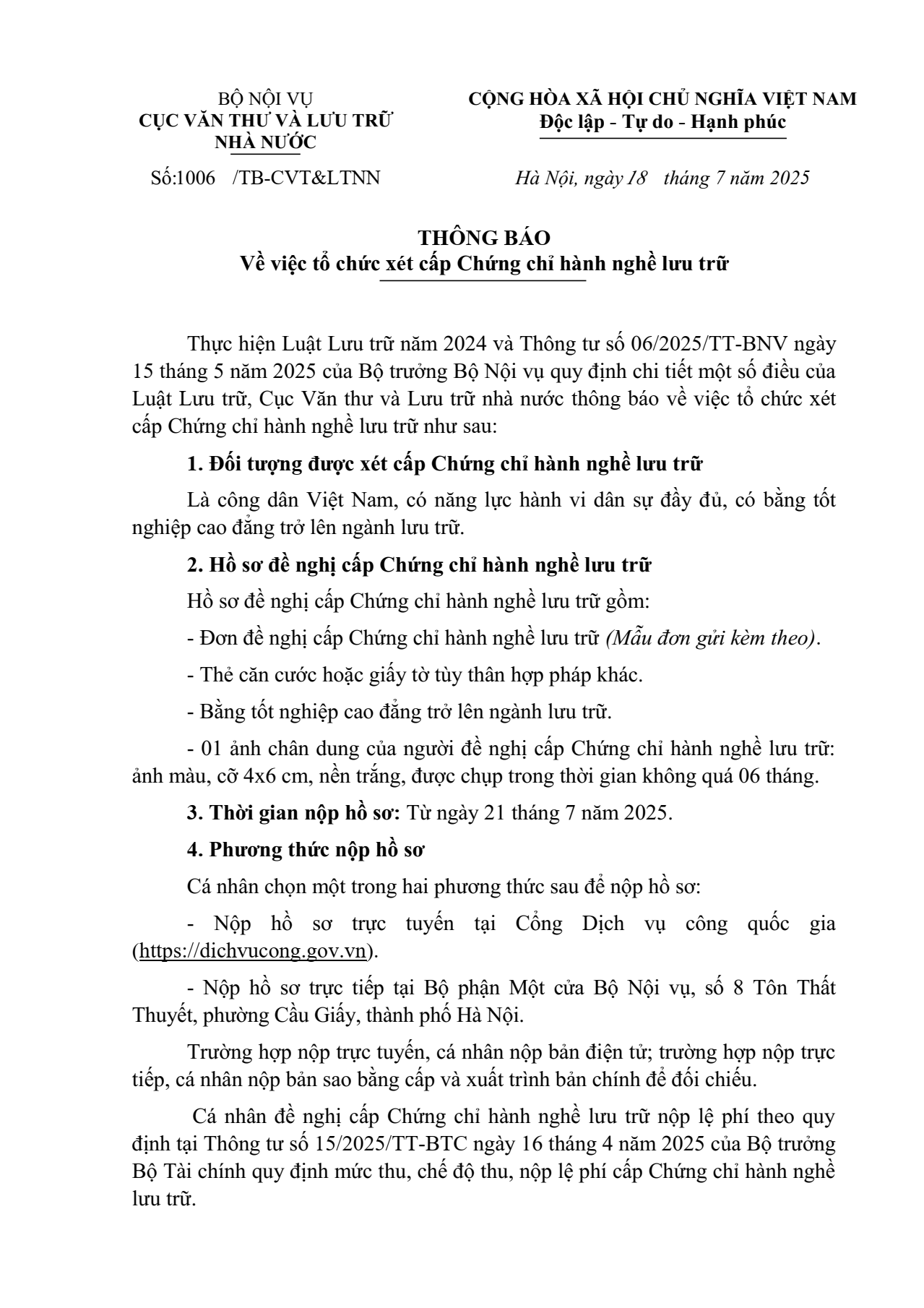 Thông báo số 1006/TB-CVT<NN ngày 18/7/2025 của Cục Văn thư & Lưu trữ nhà nước về việc tổ chức xét cấp Chứng chỉ hành nghề lưu trữ.