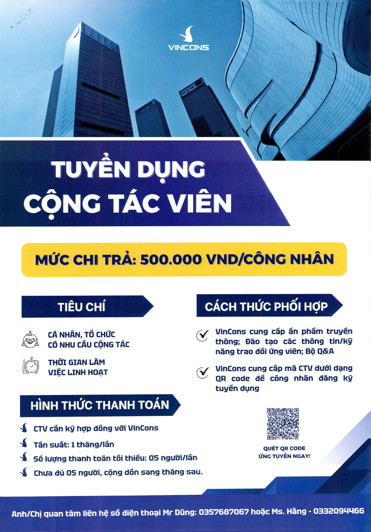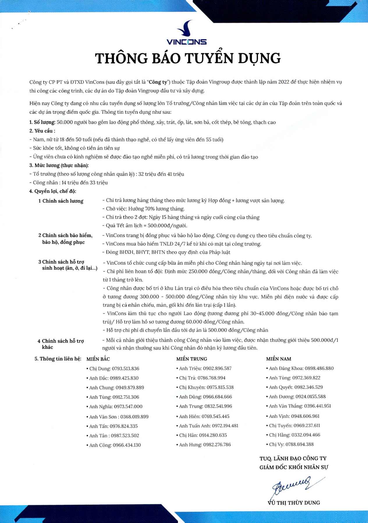 Đính kèm Thông báo tuyển dụng của Công ty Cổ phần Phát triển & Đầu tư Xây dựng VINCONS.