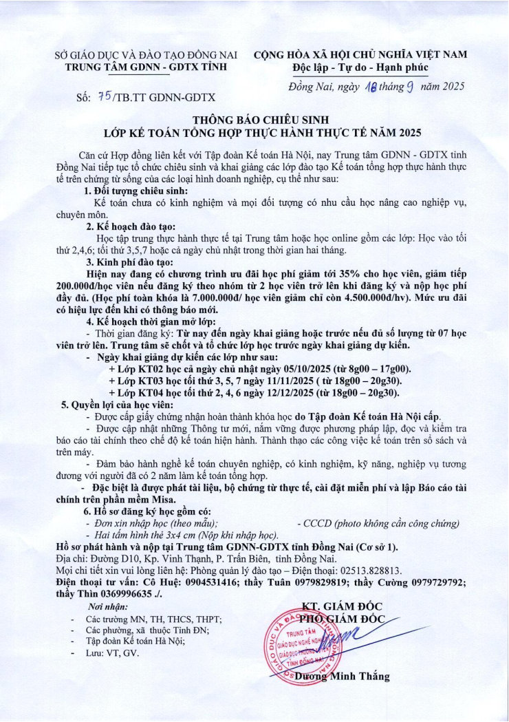 Thực hiện hợp đồng liên kết với Tập đoàn Kế toán Hà Nội, Trung tâm GDNN – GDTX tỉnh Đồng Nai tiếp tục chiêu sinh và khai giảng các lớp đào tạo Kế toán tổng hợp thực hành thực tế trên chứng từ sổ sách doanh nghiệp, cụ thể như sau:
