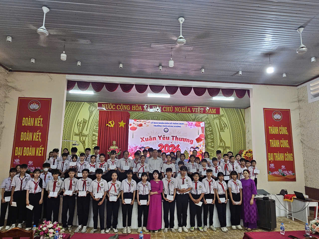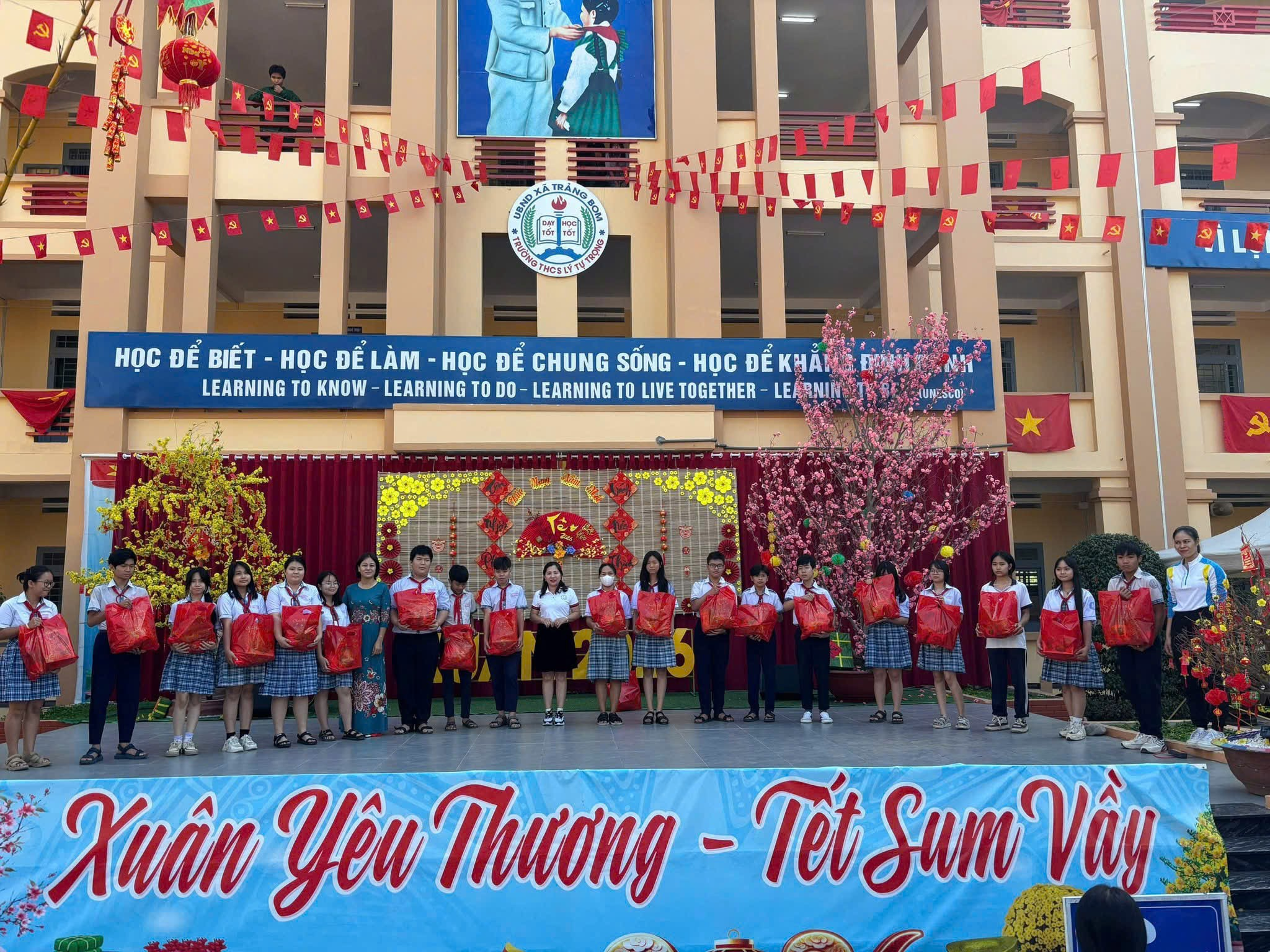 Thực hiện đúng tinh thần Kế hoạch số 433/KH-SGDĐT của Sở Giáo dục và Đào tạo tỉnh Đồng Nai về chương trình "Xuân yêu thương", không khí Tết tại các trường học ở xã Trảng Bom không chỉ có niềm vui bề nổi mà còn chứa đựng chiều sâu của lòng nhân ái. Tại hầu hết các trường học, không gian xuân còn gắn liền với những buổi lễ trao học bổng, tặng quà cho học sinh, giáo viên có hoàn cảnh khó khăn. Tổng số quà các trường vận động tổ chức trao là 1.622 suất và gần 250 suất học bổng với tổng trị già gần 980 triệu đồng. Mỗi phần quà trao đi là một lời khẳng định về tinh thần "tương thân tương ái", "lá lành đùm lá rách" của dân tộc. Đồng thời giáo dục tình yêu thương, sự đồng cảm và lòng tự hào dân tộc cho học sinh thông qua những hành động thiết thực nhất". Việc tổ chức trao quà diễn ra trang trọng ngay tại sân trường, giữa không gian mai vàng rực rỡ, giúp các em học sinh có hoàn cảnh khó khăn cảm nhận được sự ấm áp, khích lệ để tiếp tục vươn lên trong học tập.