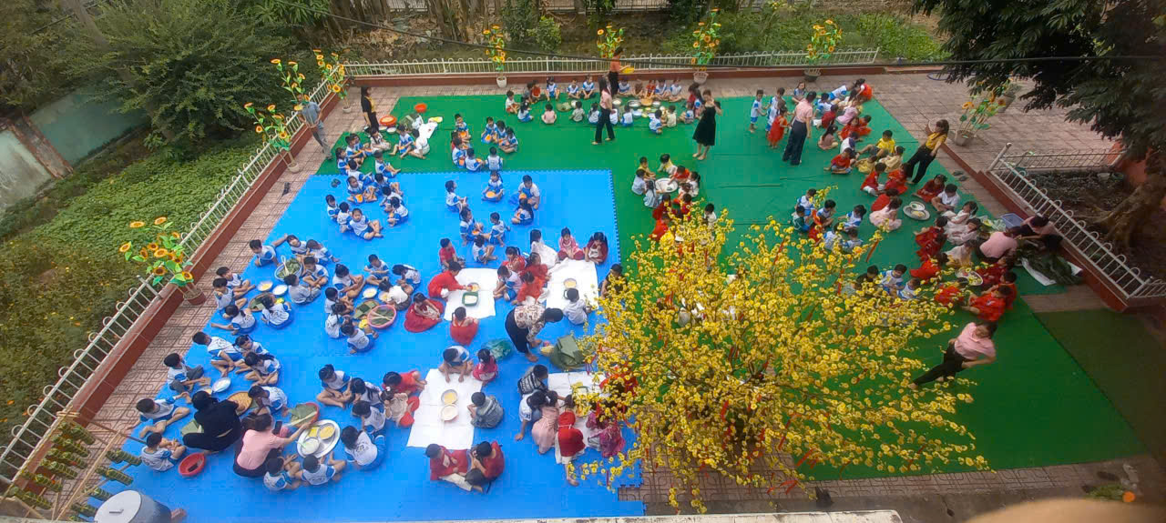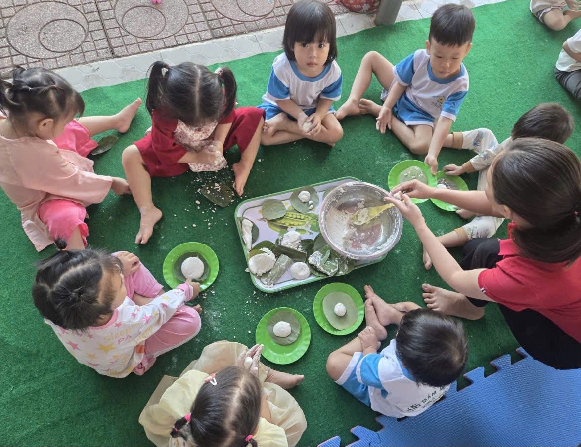Bên cạnh đó, các trường mầm non như Trường Mầm non Hoa Mai, các bé nhỏ cũng được sống trong tinh thần dân tộc thông qua hoạt động gói bánh chưng, bánh tét và bánh dày. Những đôi tay nhỏ xíu, lúng túng bên lá dong, sợi lạt nhưng ánh mắt rạng ngời niềm tự hào. Đó chính là cách văn hóa thấm sâu vào tâm hồn trẻ thơ một cách tự nhiên nhất.