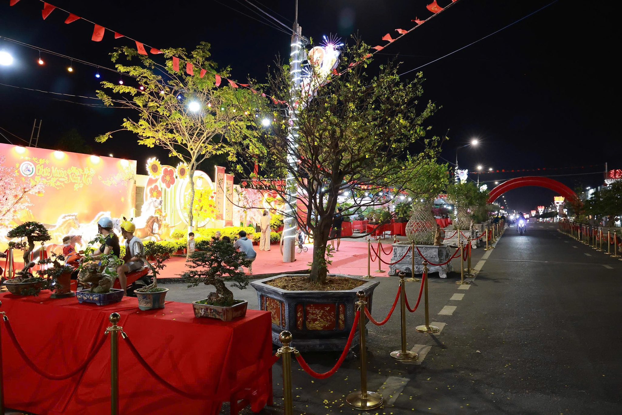 Nếu hoa mang đến sự rực rỡ, thì khu vực cây cảnh nghệ thuật lại mang đến sự tĩnh lặng và chiều sâu triết học. Tùng La Hán thế trực, tán lá xanh mướt, được cắt tỉa tỉ mỉ. Sự thanh cao, bền bỉ và trường tồn. Mai chiếu thủy, gốc xù xì, hoa trắng nhỏ li ti tỏa hương thơm ngát, mang lại bình an cho gia đạo. Lộc vừng dáng huyền, thân cây uốn lượn mềm mại như dòng thác đổ. thu hút tài lộc và sự thịnh vượng. Đặc biệt, năm nay xuất hiện nhiều tác phẩm Bonsai ăn quả như lựu, khế, quýt mini. Những chậu cây nhỏ xinh nhưng sai trĩu quả không chỉ đẹp mắt mà còn tượng trưng cho một năm mới "đơm hoa kết trái", vạn sự hanh thông. Những gốc mai chiếu thủy, linh sam, sanh, si được các nghệ nhân uốn nắn qua hàng chục năm. Mỗi thế cây đều mang một triết lý nhân sinh sâu sắc: Dáng Phụ Tử- gợi nhắc tình cha con. Dáng Trực - thể hiện sự ngay thẳng, chính trực. Dáng Huyền-mong manh nhưng bền bỉ như sức sống của thiên nhiên. Sự góp mặt của các tác phẩm Bonsai không chỉ nâng tầm quy mô của hội hoa mà còn khẳng định trình độ tay nghề điêu luyện của những người yêu cây cảnh tại địa phương.