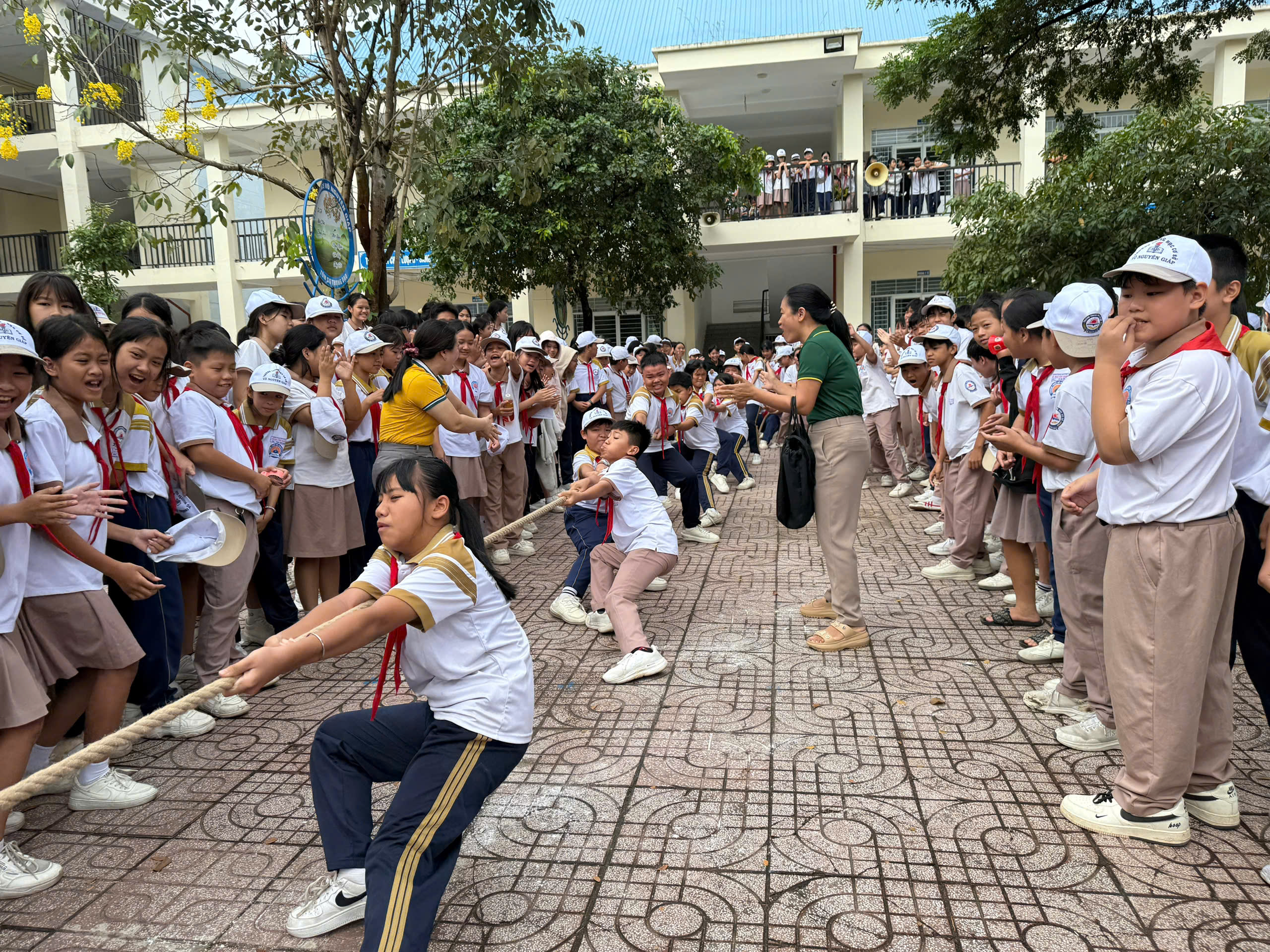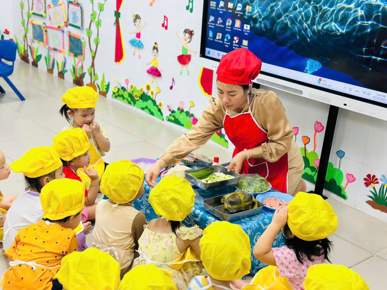 Đối với bậc Mầm non, các hoạt động được tổ chức với sự hồn nhiên, vui tươi, nhấn mạnh vào sự phát triển thể chất và kỹ năng sống. Ngày hội Phát triển Vận động “Năng lượng mới cả ngày vui”: Các bé đã được tham gia một ngày hội thể thao đầy màu sắc với tinh thần “Bé khỏe – Bé vui – Cùng nhau tỏa sáng”. Những trò chơi vận động quen thuộc như nhảy bao bố, kéo co hay các trò chơi dân gian truyền thống như ô ăn quan không chỉ giúp trẻ rèn luyện sức khỏe, sự khéo léo mà còn bồi đắp tình cảm bạn bè và tinh thần đồng đội. Bên cạnh các hoạt động thể chất, các giờ học cũng được thiết kế sáng tạo, tạo không gian vui tươi, ý nghĩa. Hoạt động bé tập làm nội trợ: Giúp trẻ hình thành kỹ năng tự phục vụ cơ bản. Hoạt động STEAM cánh diều: Khuyến khích sự tò mò, khám phá khoa học từ sớm. Ứng dụng Công nghệ thông tin: Dạy trẻ làm quen với công nghệ. Phân loại rác thải: Giáo dục ý thức bảo vệ môi trường. Đặc biệt, để nâng cao chất lượng giáo dục, bậc Mầm non đã tổ chức Hội thi Giáo viên dạy giỏi cấp trường. Đây là dịp để các cô giáo thể hiện tài năng, sự sáng tạo trong chuyên môn, đúc kết kinh nghiệm, tạo ra những bài học chất lượng nhất cho trẻ.