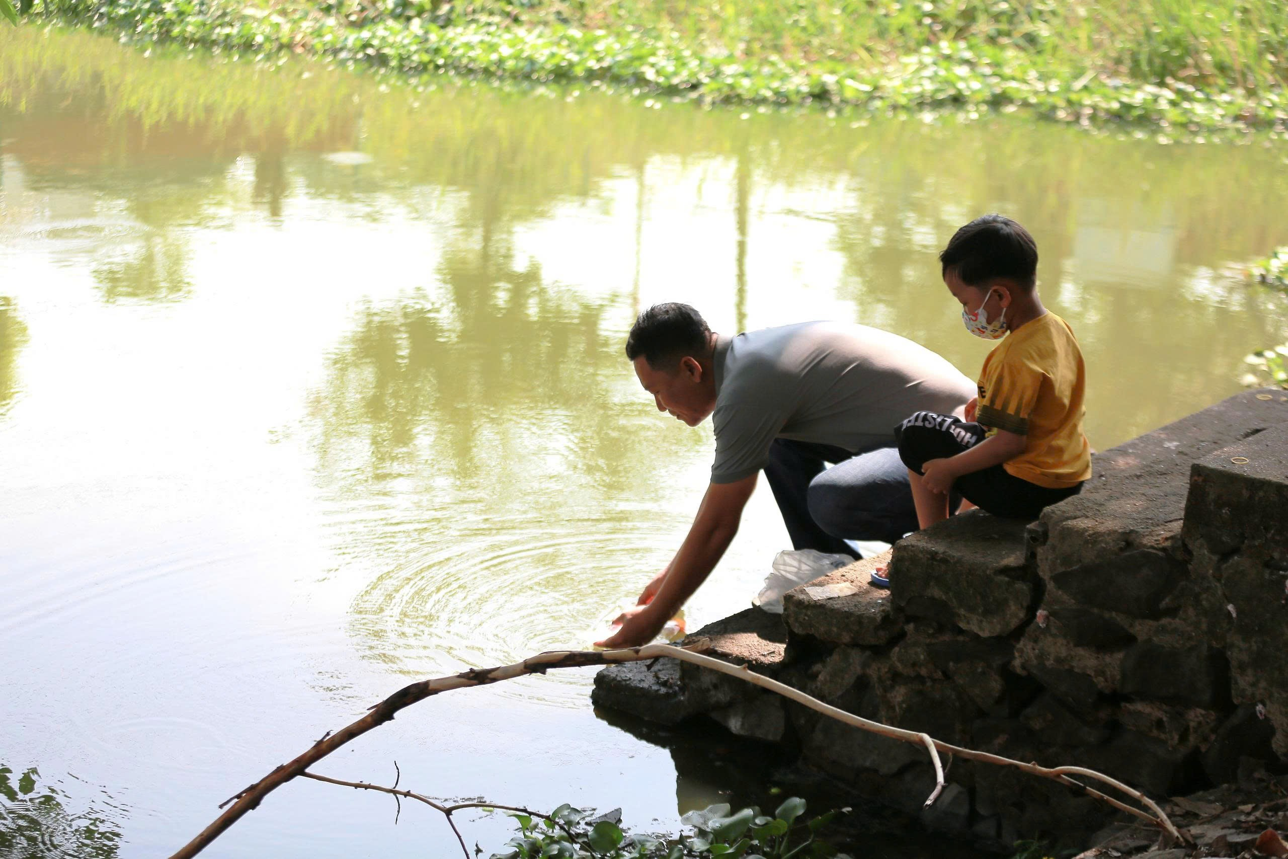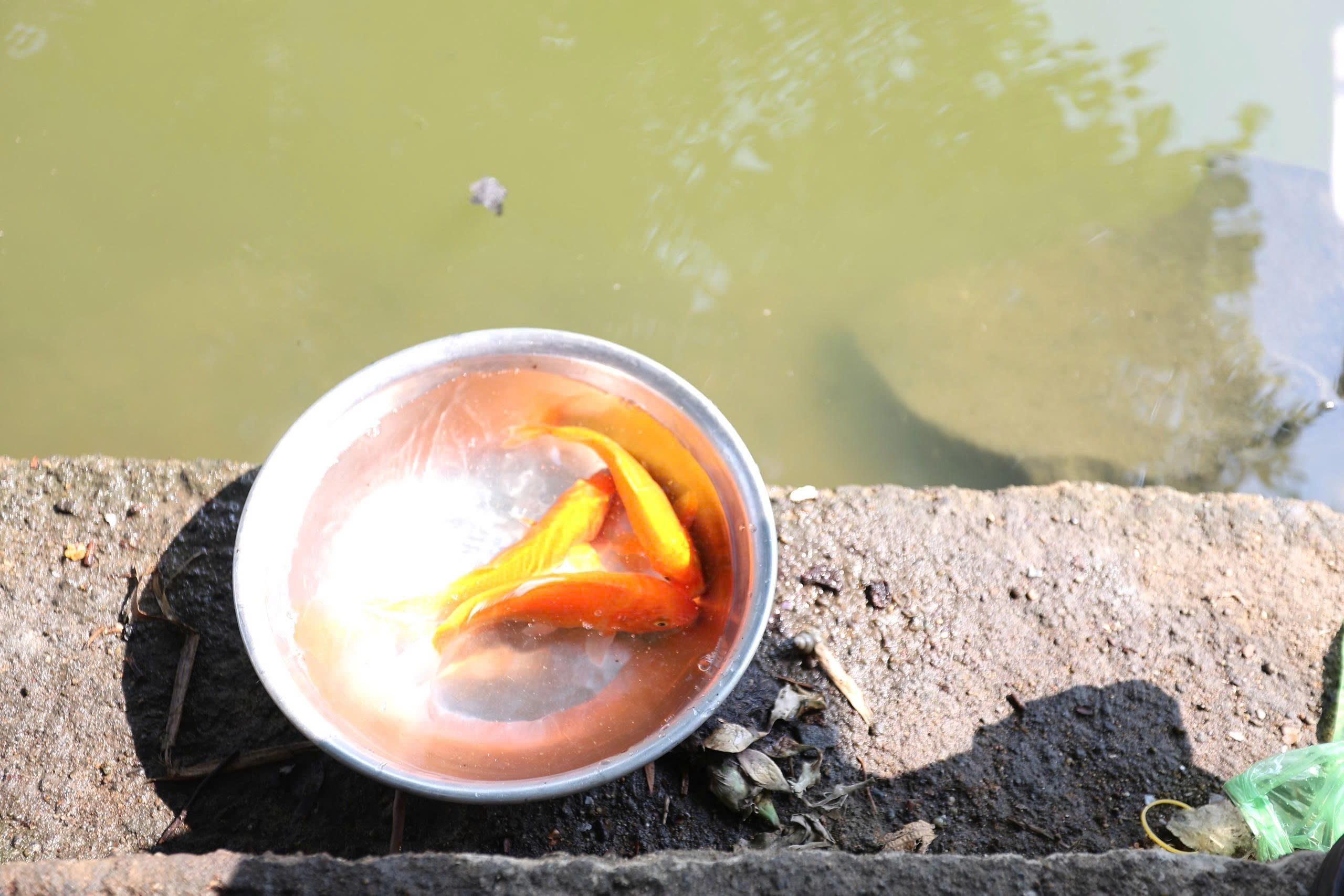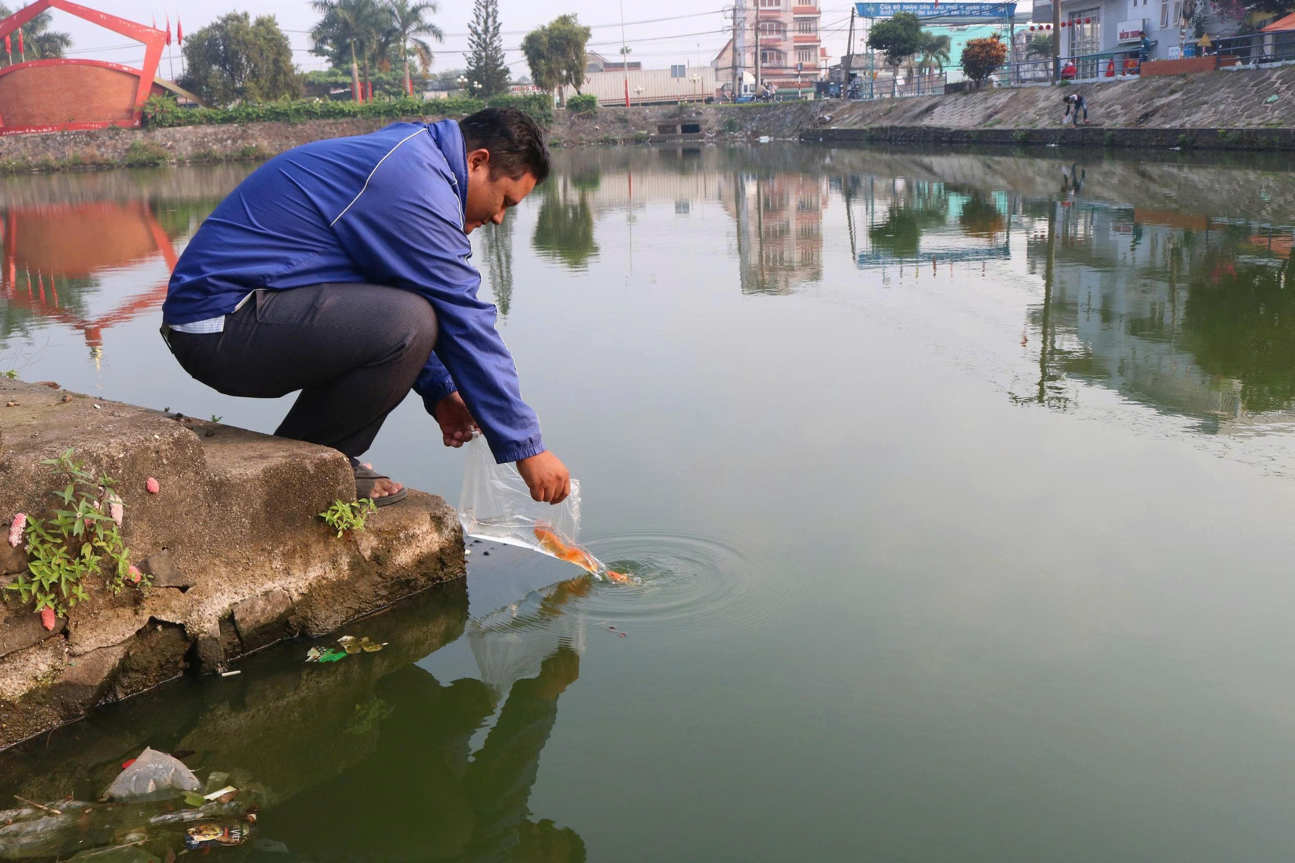 Người dân thả cá chép trong ngày tiễn “ông Táo về trời” tai Hồ Thư viện Trảng Bom