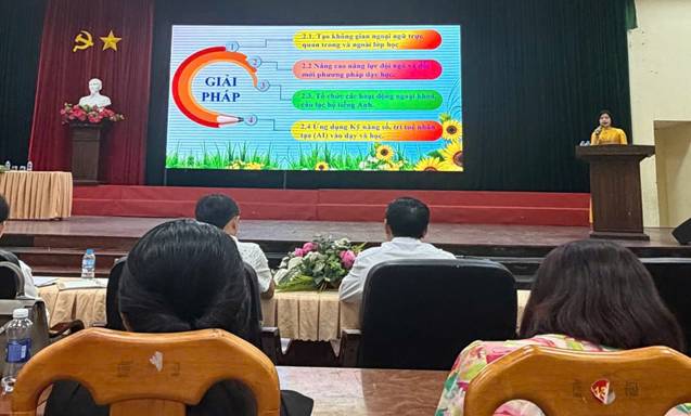 Cô Lê Thị Thu Hà – Hiệu trưởng trường THCS Lý Tự trọng trình bày tham luận tại Hội thảo chuyên đề các giải pháp nâng cao chất lượng dạy và học tiếng Anh, định hướng đưa tiếng Anh trở thành ngôn ngữ thứ hai trong trường học trên địa bàn tỉnh Đồng Nai