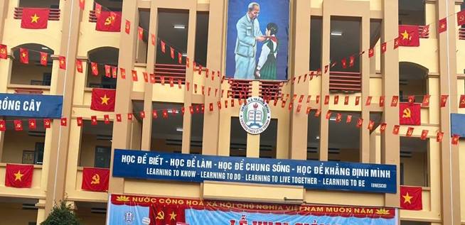 Bước chân vào khuôn viên Trường THCS Lý Tự Trọng, điều dễ dàng nhận thấy nhất chính là sự hiện diện của tiếng Anh ở khắp mọi nơi. Không còn là những khẩu hiệu khô khan, nhà trường đã "song ngữ hóa" không gian từ bảng chỉ dẫn, hệ thống biển báo đến các tấm pa nô rực rỡ. Những thông điệp như "Learning to Know - Learning to Do - Learning to Live Together - Learning to Be" (Học để biết – Học để làm – Học để chung sống – Học để tự khẳng định) hay những câu trích dẫn về tri thức trong thư viện đã giúp học sinh tiếp nhận ngoại ngữ một cách tự nhiên, thường xuyên và liên tục. Sự đổi mới không dừng lại ở vẻ ngoài. Nhà trường đã mạnh dạn triển khai dạy học song ngữ ở một số môn học như Toán, Ngữ văn và Địa lý. Thay vì những giờ học nặng về lý thuyết, các em học sinh lớp 6 đã bắt đầu làm quen với các thuật ngữ chuyên ngành bằng tiếng Anh như "Angles" (Góc) trong môn Toán hay gọi tên các loài động vật "elephants, tigers, cheetahs" trong tiết Địa lý. Cách tiếp cận này không chỉ bổ sung vốn từ vựng mà còn tạo sự hào hứng, mới mẻ, xóa tan tâm lý ngại ngùng khi sử dụng ngoại ngữ.