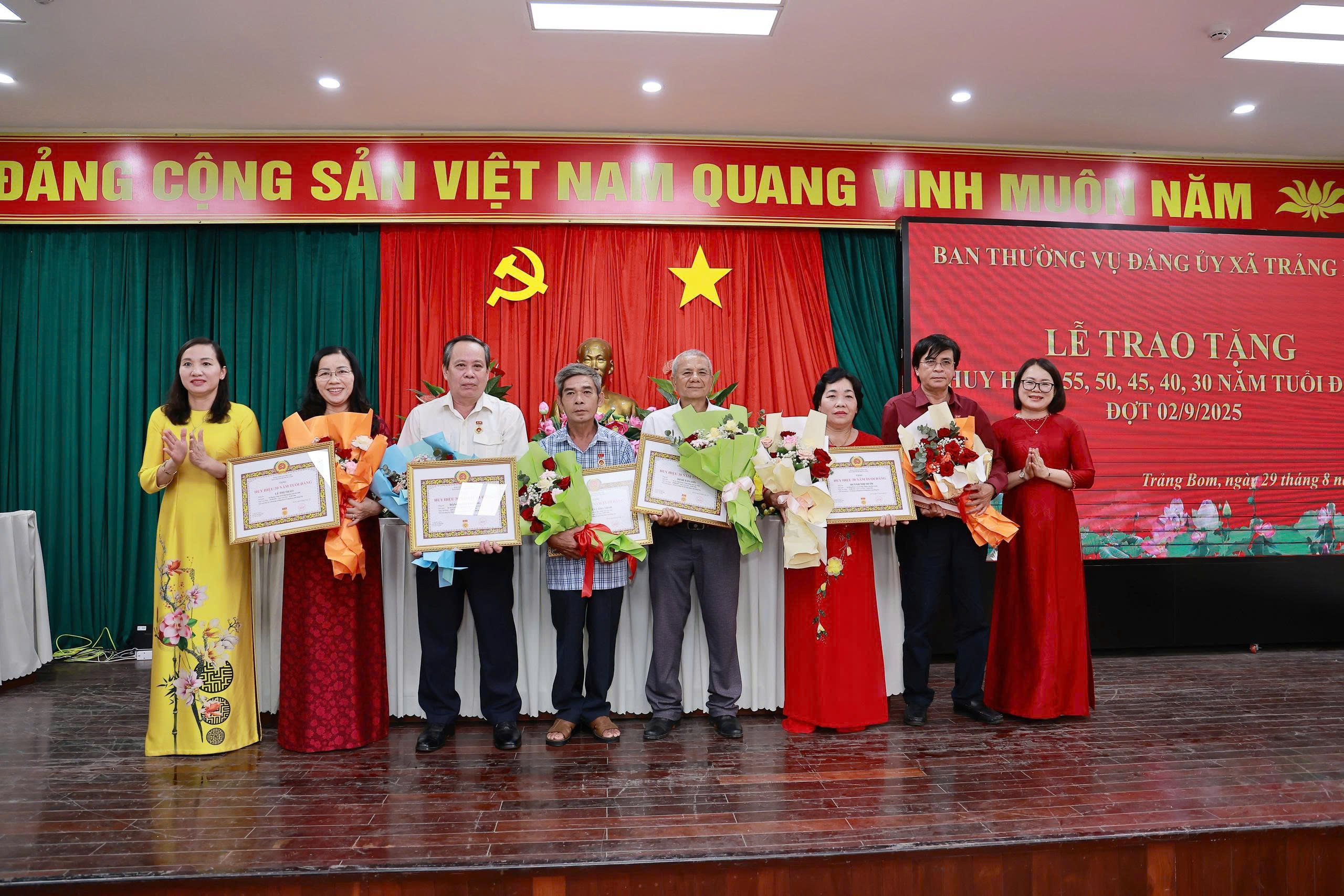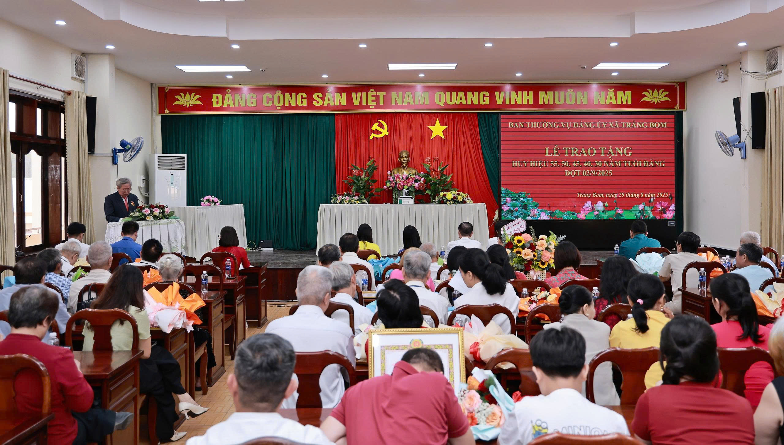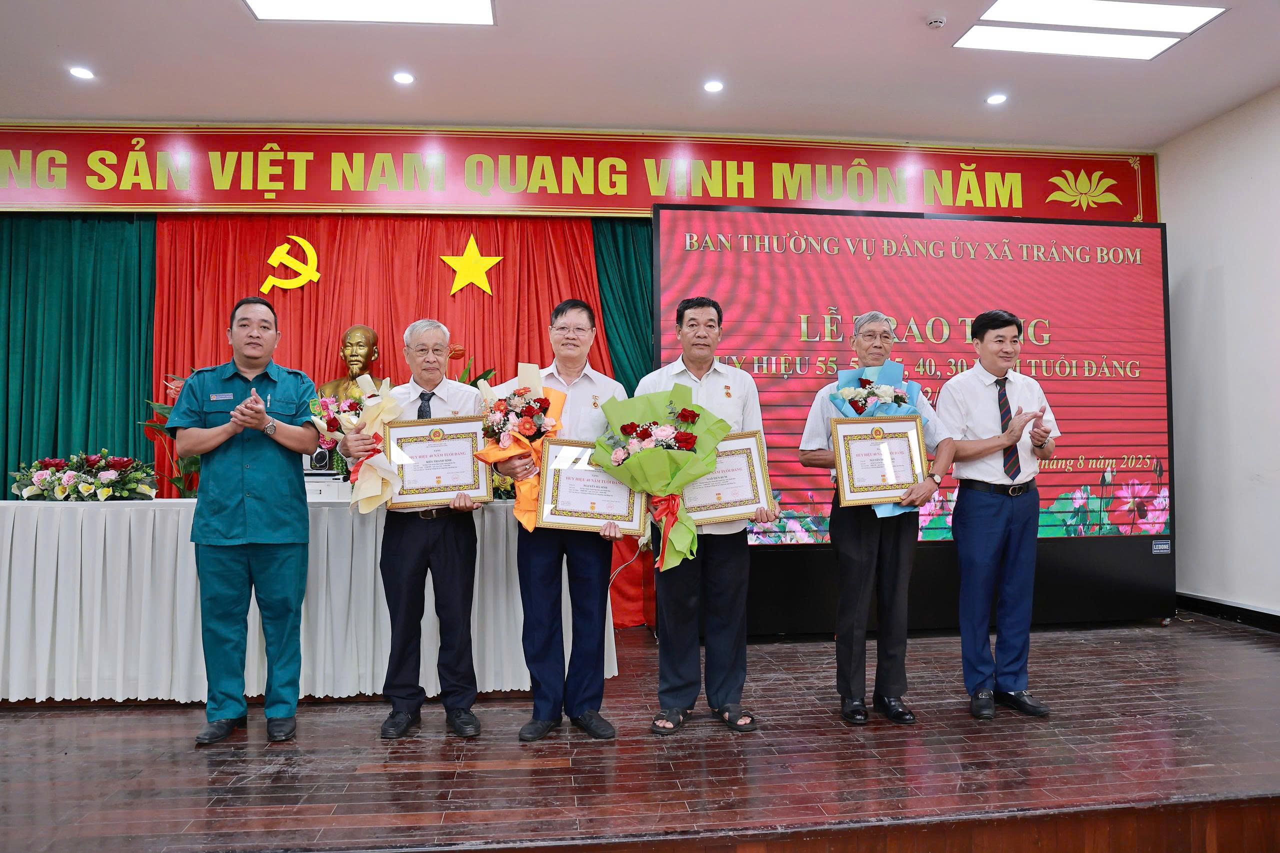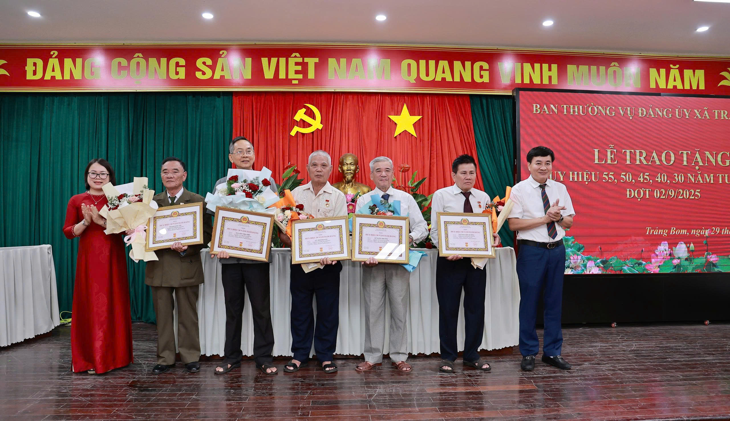 Trong đợt này, Đảng bộ xã Trảng Bom có 03 đồng chí được trao tặng Huy hiệu 55 năm tuổi Đảng, 05 đồng chí được trao tặng Huy hiệu 50 năm tuổi Đảng, 04 đồng chí được trao tặng Huy hiệu 45 năm tuổi Đảng, 06 đồng chí được trao tặng Huy hiệu 40 năm tuổi Đảng và 06 đồng chí được trao tặng Huy hiệu 30 năm tuổi Đảng.