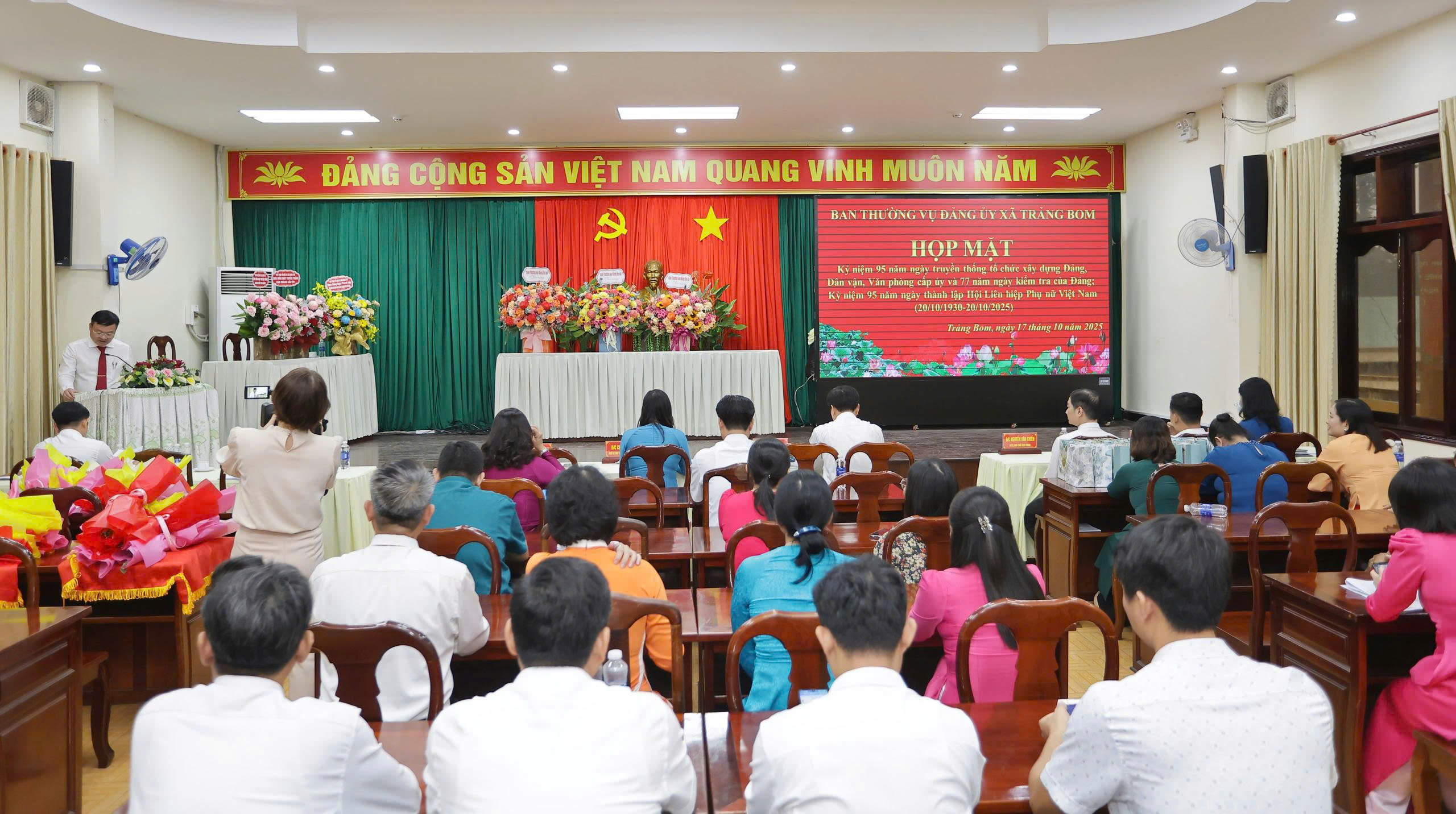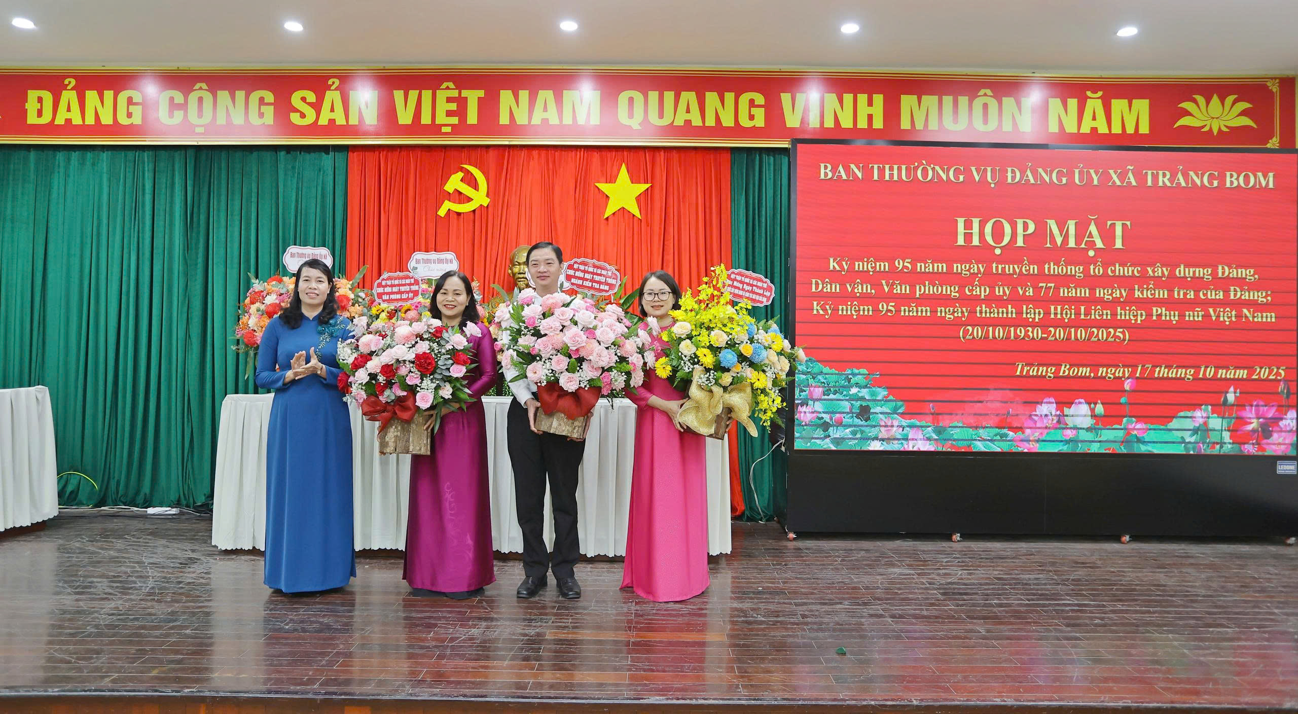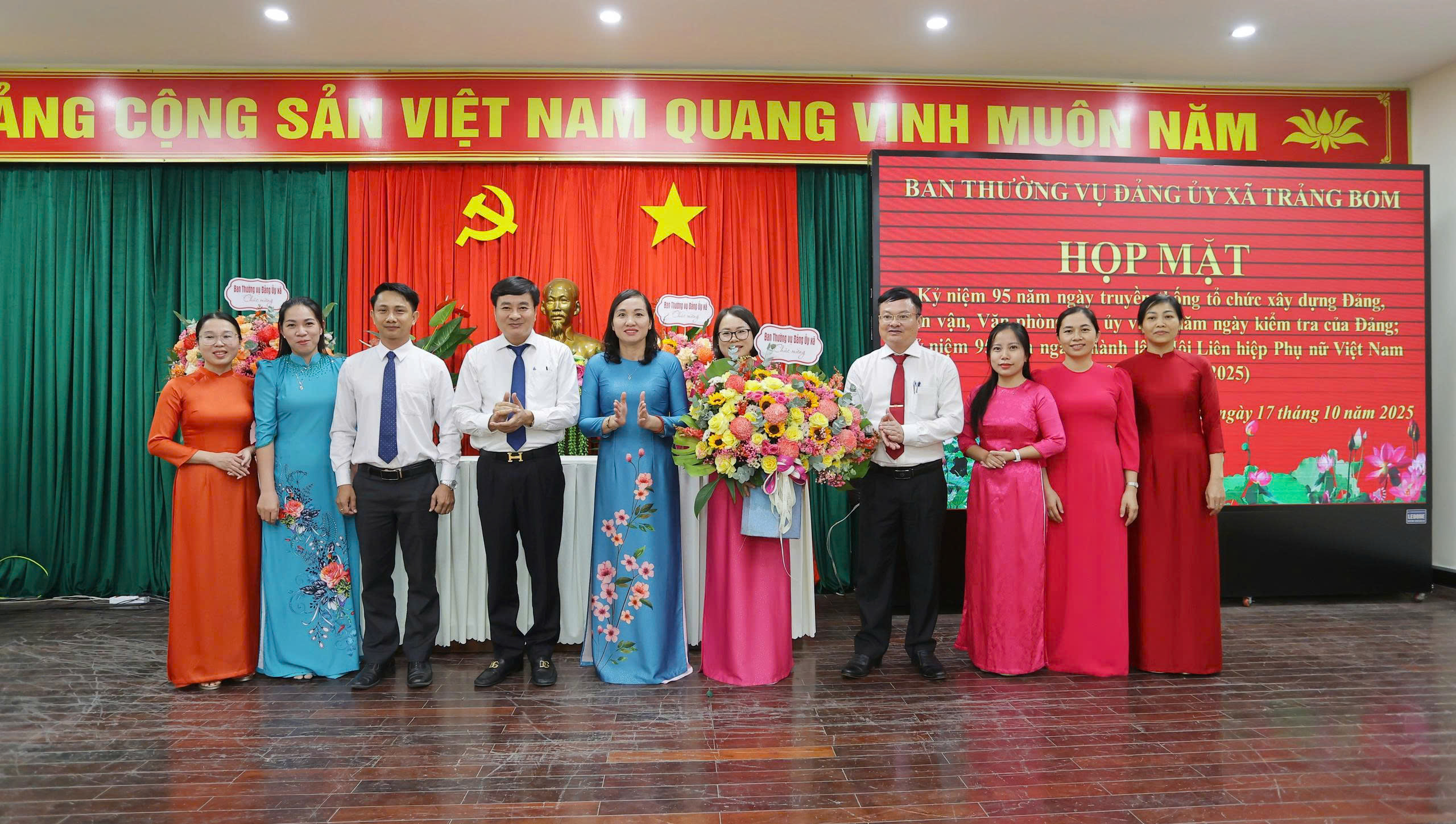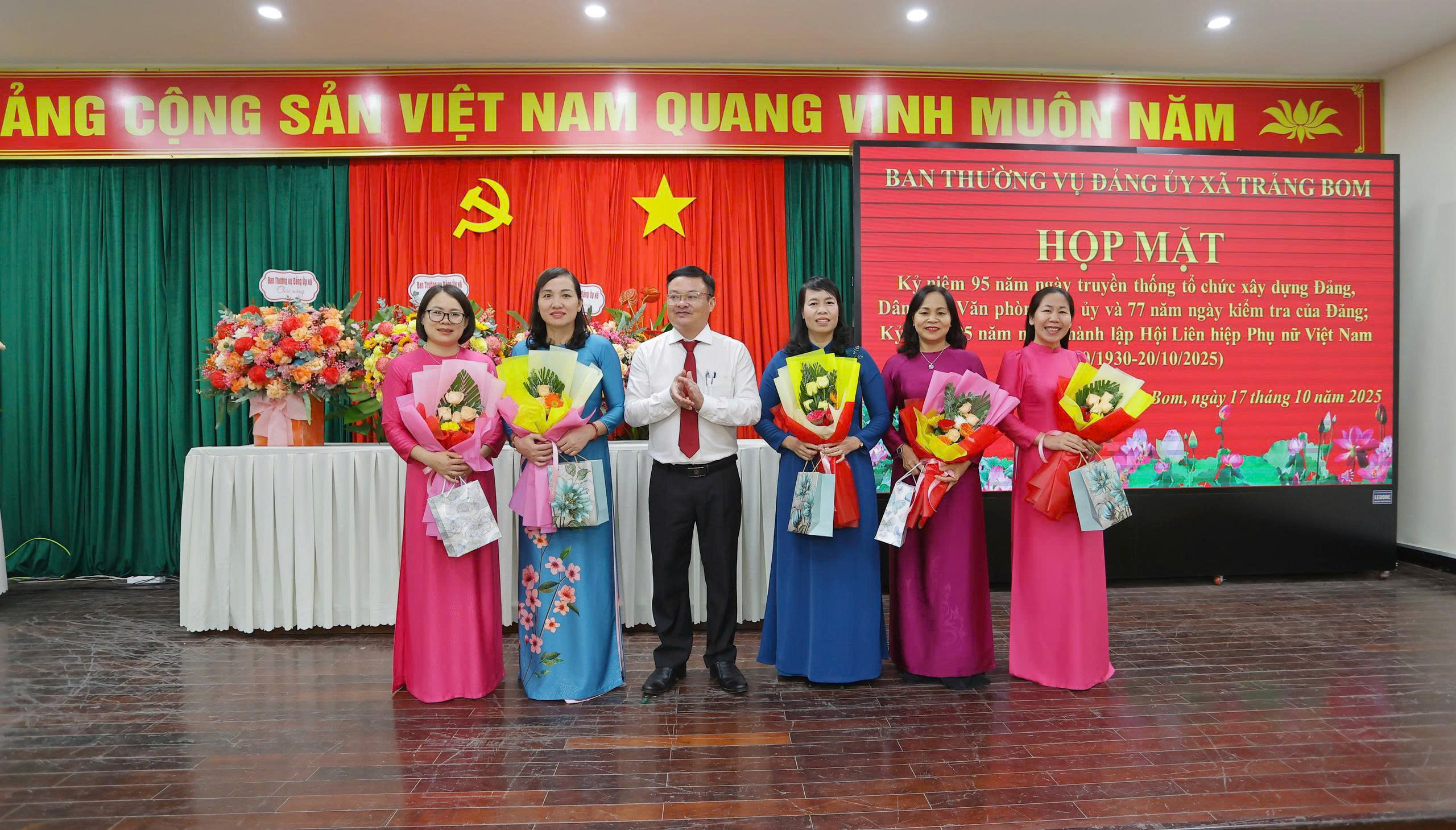 Dịp này, nhằm tri ân những cống hiến thầm lặng của các cơ quan tham mưu và tôn vinh vai trò của phụ nữ, Ban Thường vụ Đảng ủy xã Trảng Bom đã tặng những bó hoa tươi thắm và phần quà ý nghĩa gửi đến các đơn vị đại diện cho các ngành công tác xây dựng Đảng và dành tặng riêng cho các chị em phụ nữ, những người đã và đang đóng góp tích cực vào sự nghiệp xây dựng quê hương, chào mừng 95 năm Ngày thành lập Hội Liên hiệp Phụ nữ Việt Nam 20/10 đầy ý nghĩa.