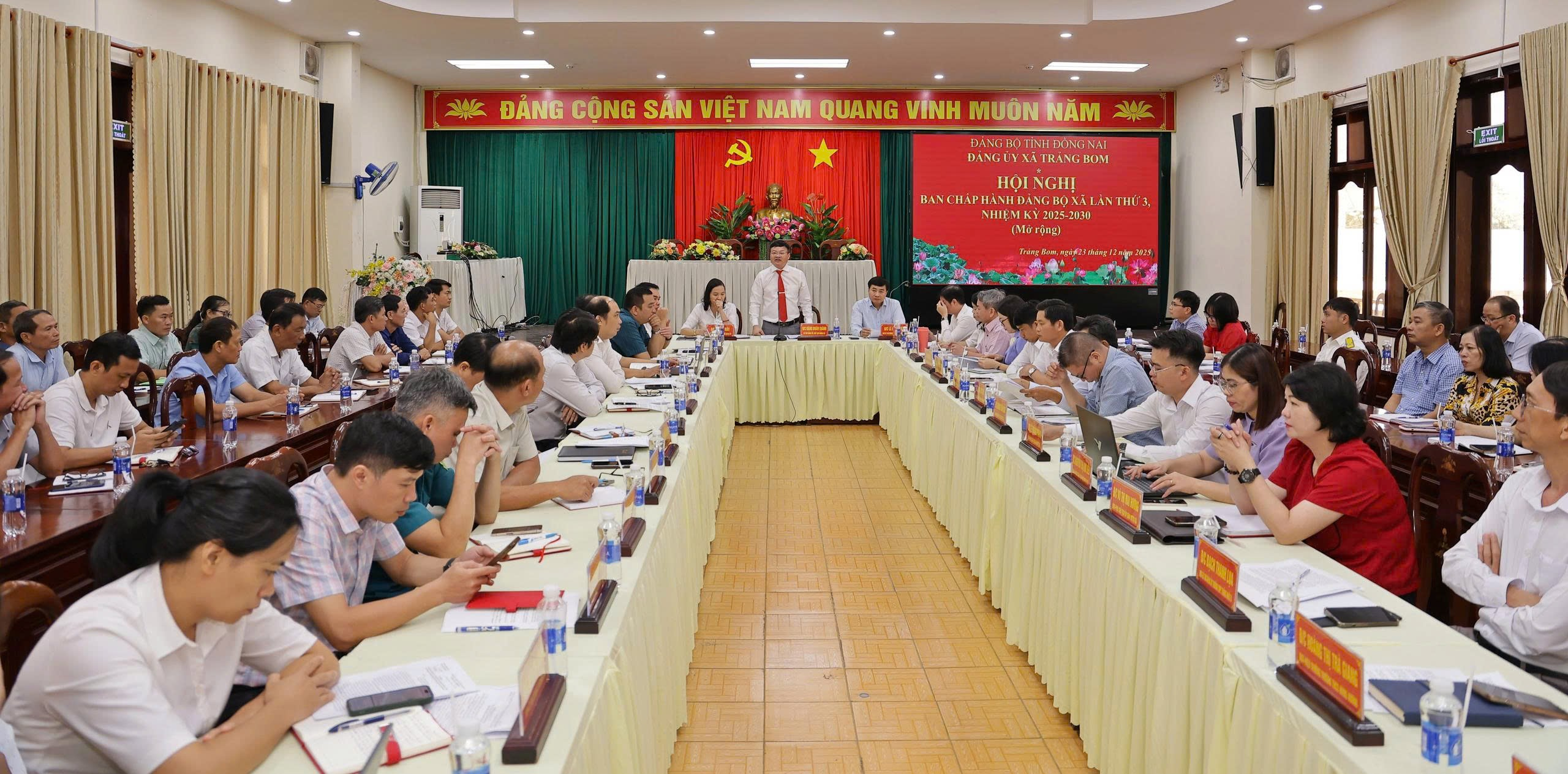 Trong năm 2025, cấp ủy Đảng, chính quyền xã Trảng Bom đã tập trung lãnh đạo, chỉ đạo thực hiện tốt nhiệm vụ chính trị theo chương trình, kế hoạch đề ra. Nổi bật là: Thương mại - dịch vụ phát triển ổn định, giá cả thị trường được kiểm soát; sản xuất nông nghiệp duy trì tăng trưởng bền vững; triển khai hiệu quả các chương trình OCOP, nông thôn mới và giảm nghèo bền vững. Công tác quản lý đất đai, trật tự xây dựng, tài nguyên, môi trường có nhiều chuyển biến tích cực; thu ngân sách vượt cao so với dự toán giao với gần 111 tỷ đồng, đạt 473,62%; các lĩnh vực văn hóa - xã hội được quan tâm, chất lượng giáo dục, y tế, an sinh xã hội được đảm bảo; công tác cải cách hành chính đạt hiệu quả rõ rệt, đặc biệt là tỷ lệ hồ sơ nộp trực tuyến và giải quyết hồ sơ đúng/trước hạn đạt hơn 99%. Hoàn thành chỉ tiêu giao quân năm 2025; tình hình an ninh chính trị, trật tự an toàn xã hội được giữ vững và ổn định. Công tác xây dựng Đảng được tập trung thực hiện, đã kịp thời ban hành các Chỉ thị, Nghị quyết, kế hoạch công tác để lãnh đạo, chỉ đạo tổ chức thực hiện Nghị quyết Đảng cấp trên, nhiệm vụ chính trị trên địa bàn, đặc biệt là đã tổ chức thành công Đại hội đại biểu Đảng bộ xã lần thứ I, nhiệm kỳ 2025-2030. Công tác phát triển đảng được tập trung quan tâm thực hiện, đã kết nạp được 44 đảng viên mới (vượt 01 chỉ tiêu tỉnh giao). Đối chiếu với Nghị quyết số 02-NQ/ĐU của Đảng ủy, trong năm đã thực hiện 20/20 nhóm chỉ tiêu đạt và vượt Nghị quyết,